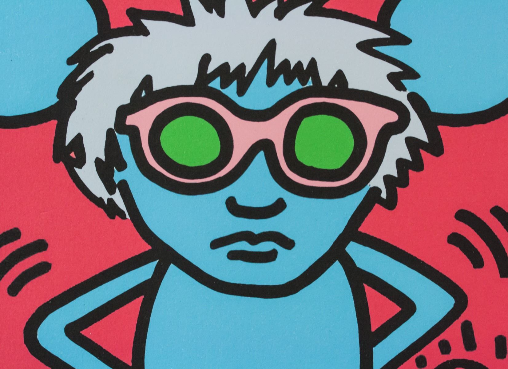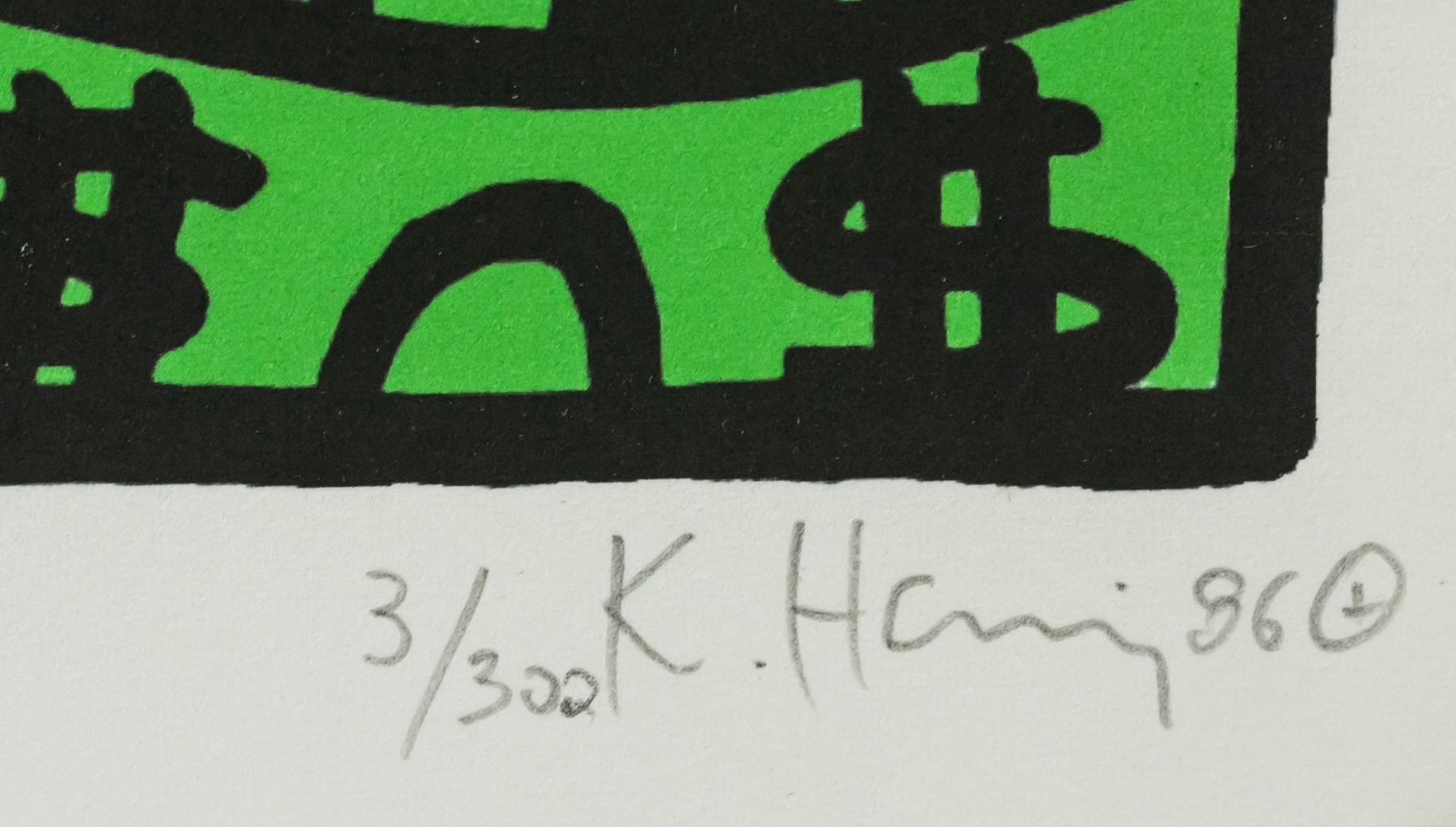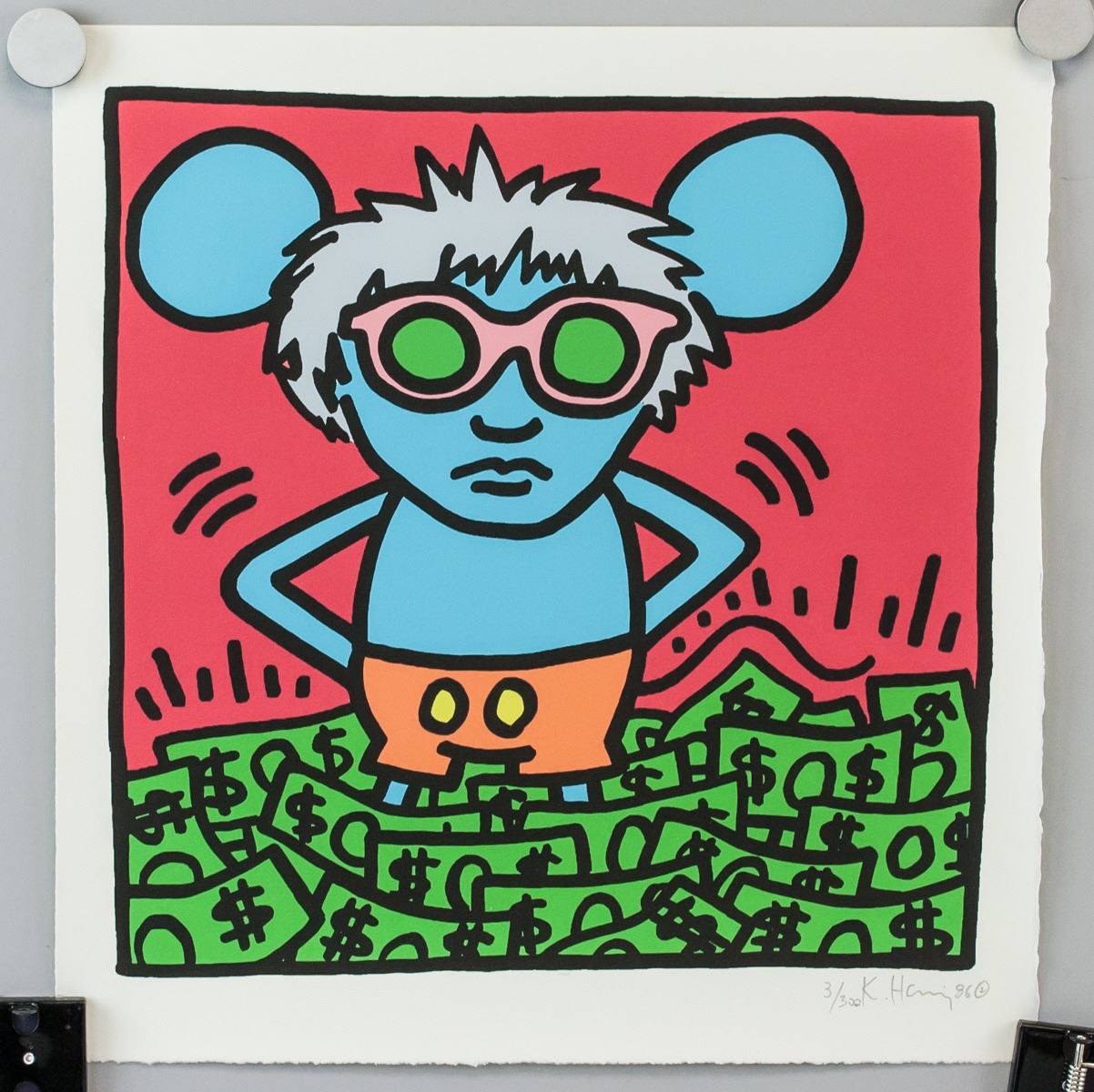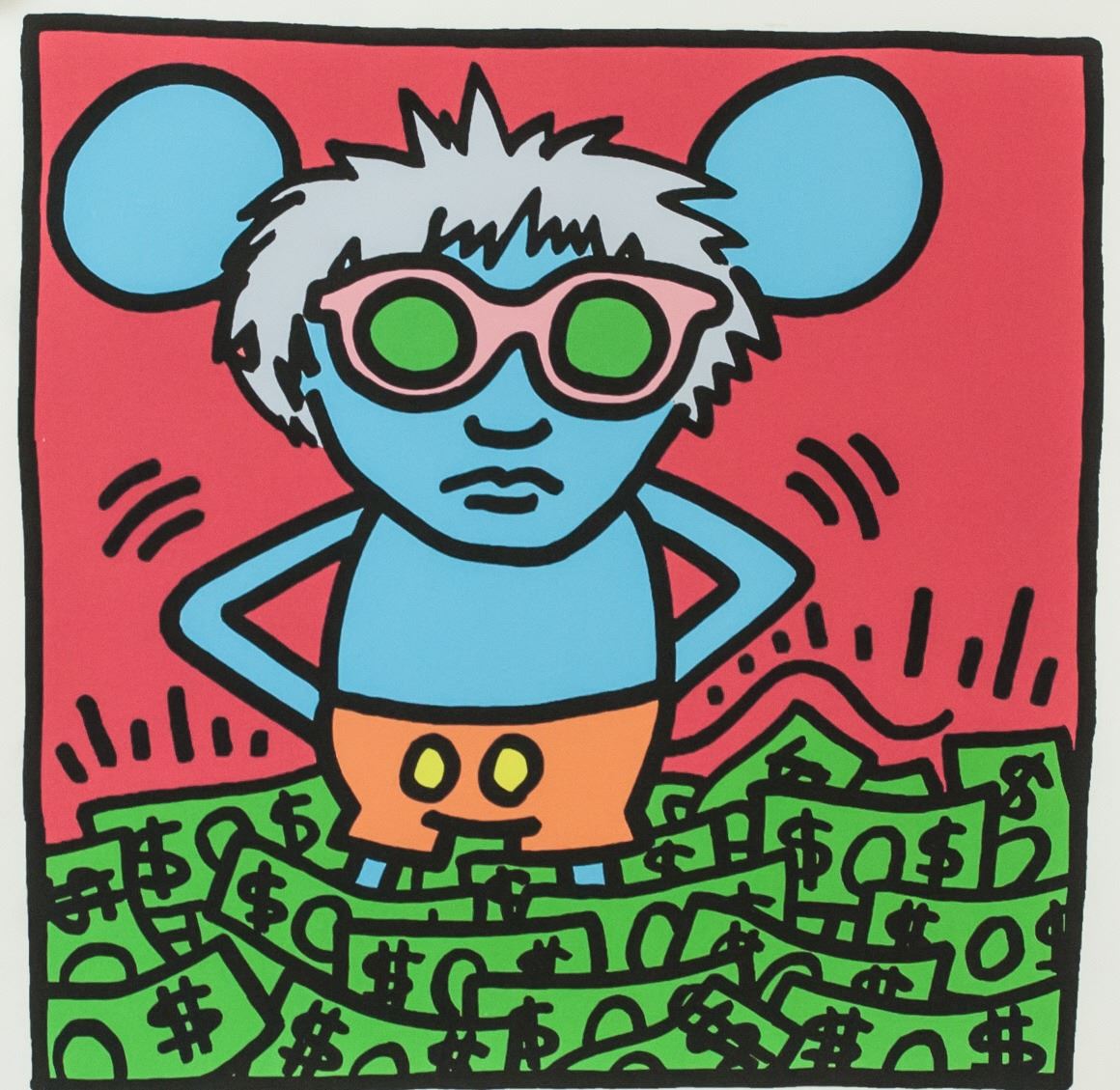 Lithograph on paper. Featuring a Mickey Mouse-like figure standing in a mound of cash. Signed "K. Haring" in the bottom right corner. "3/300" inscribed beside the signature. Stamped "FINE ART NEW YORKN" on verso. Attributed to Keith Haring (1958-1990, American). 33 x 31.5 cm (13 x 12.4 inches).