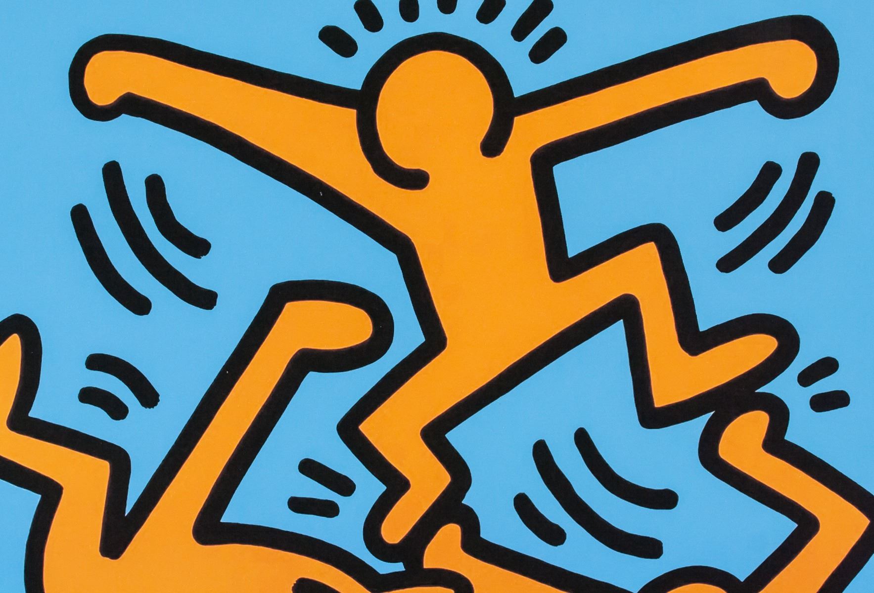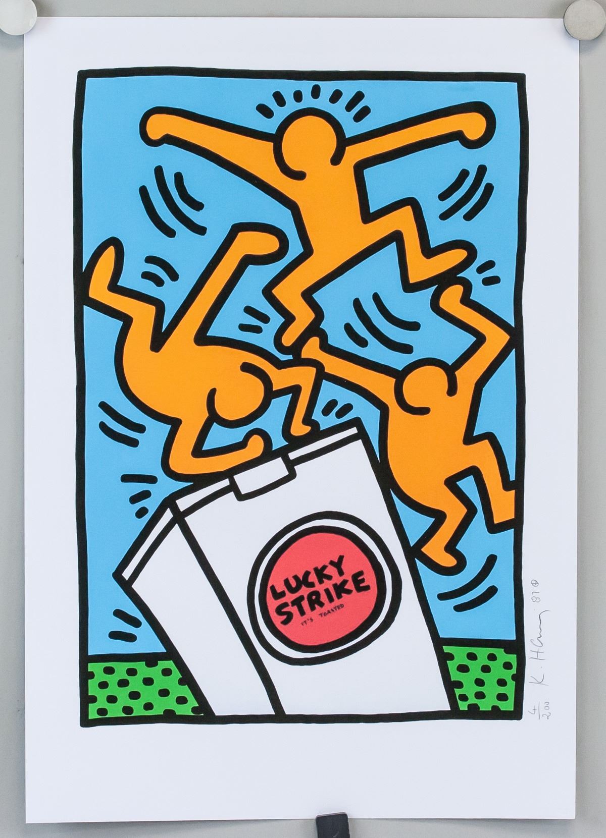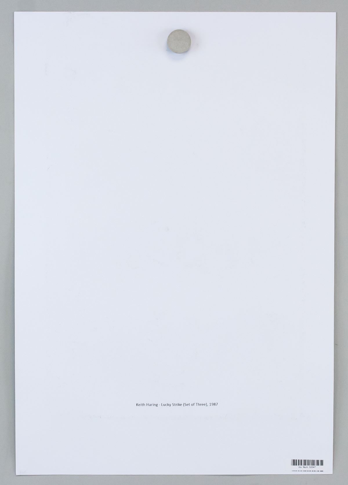 Lithograph on paper. Three dancing figures atop LUCKY STRIKE cigarette box. Signed K. Haring and inscribed 4/200 and '87 on the lower right corner. Chop mark CN. Inscribed Keith Haring - Lucky Strike (Set of Three), 1987. 48 x 33 cm (19 x 13 inches). Provenance: This lot carries limited provenance from a Southern Ontario estate