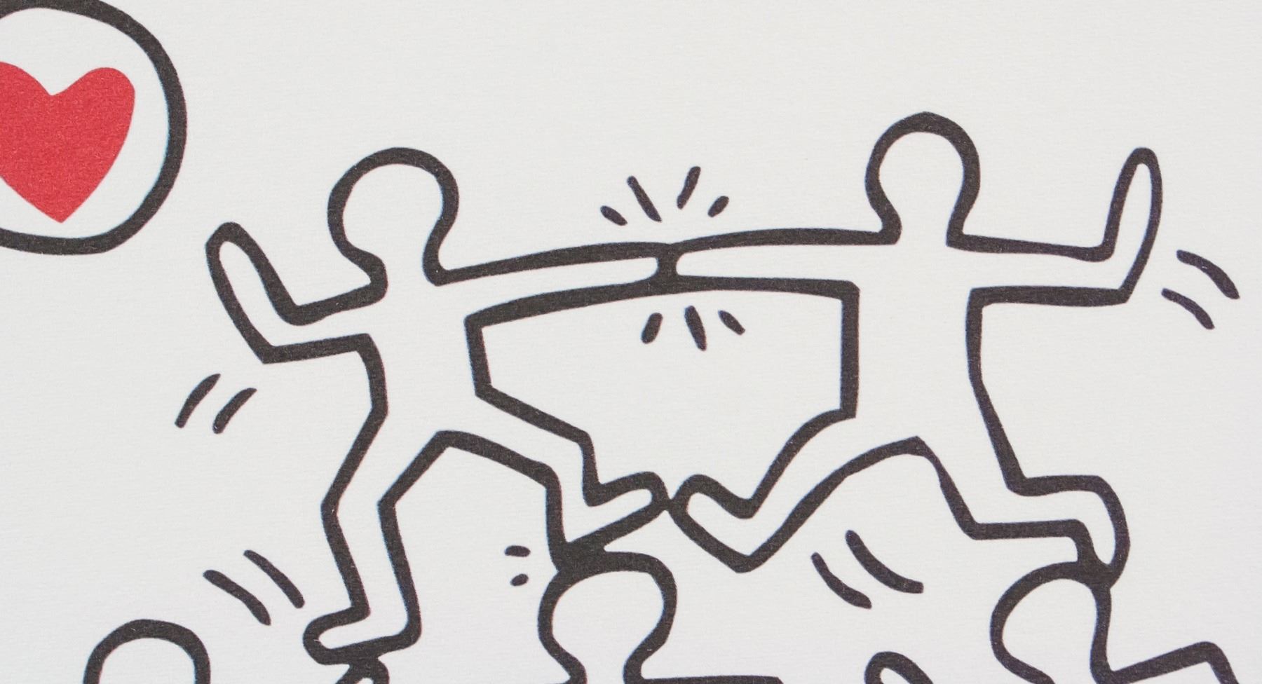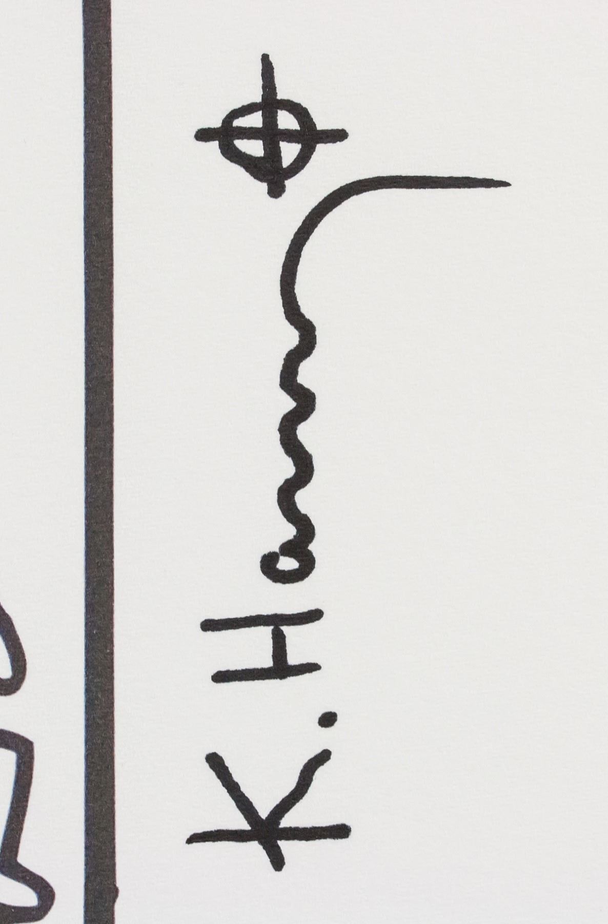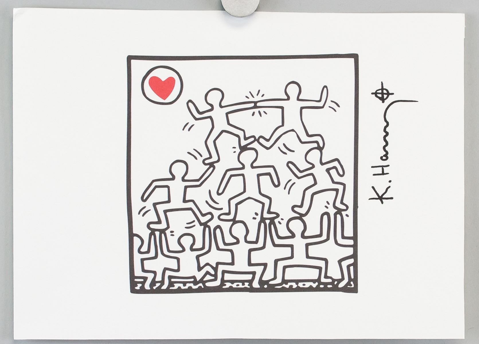 Lithograph on paper. Featuring outline figures standing one atop another in a pyramid shape. "K. Haring" printed on the right. Attributed to Keith Haring (1958-1990, American). 21 x 29 cm (8.25 x 11.4 inches). Provenance: This lot carries limited provenance from a Southern Ontario estate.