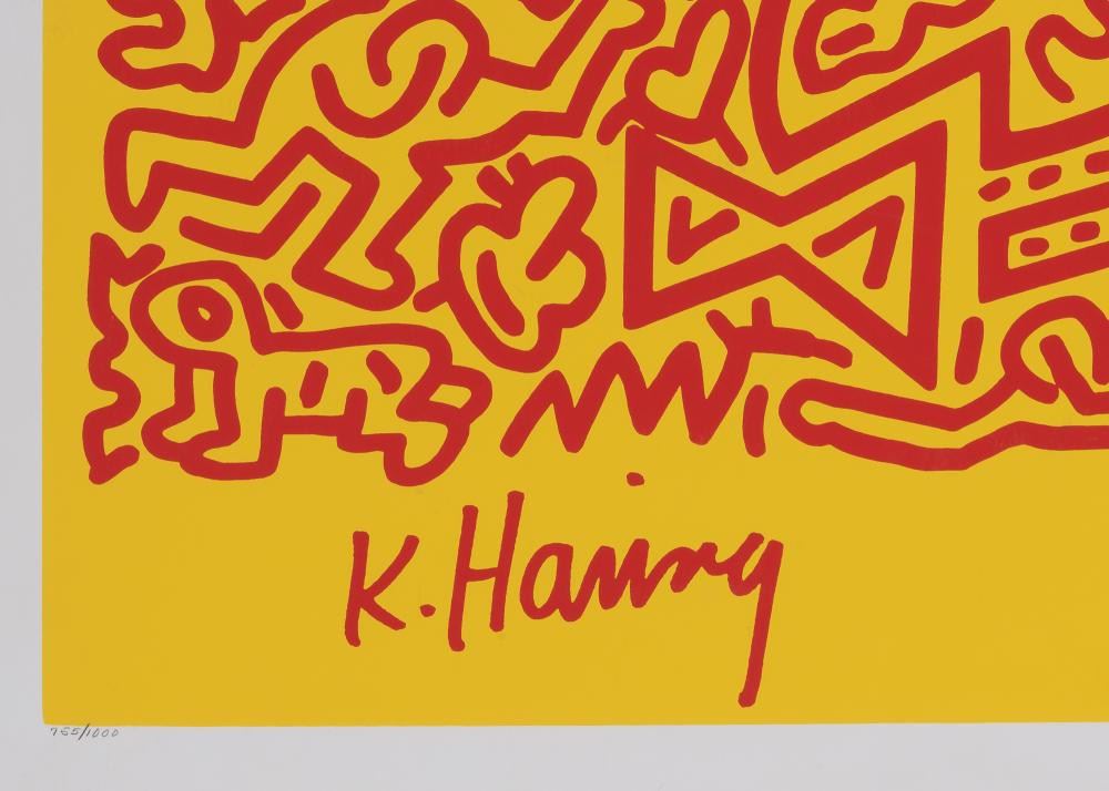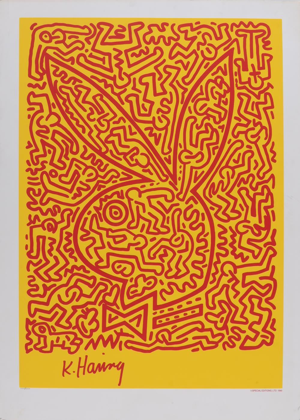 Keith Haring (1958-1990) "Playboy Series" color screenprint on heavy paper, 1990. Stamped Special Editions LTD 1990 lower right, numbered 755/1000 in pencil, lower left. Signed in the plate. Full margins, unframed. Sheet 32 x 23 inches, 81 x 58 cm. In 1986, Playboy commissioned Haring to produce several works for their magazine. After Haring died in 1990, Playboy reproduced several of these pieces in limited editions and merchandise through their subsidiary Special Editions, Ltd. in Chicago, IL.