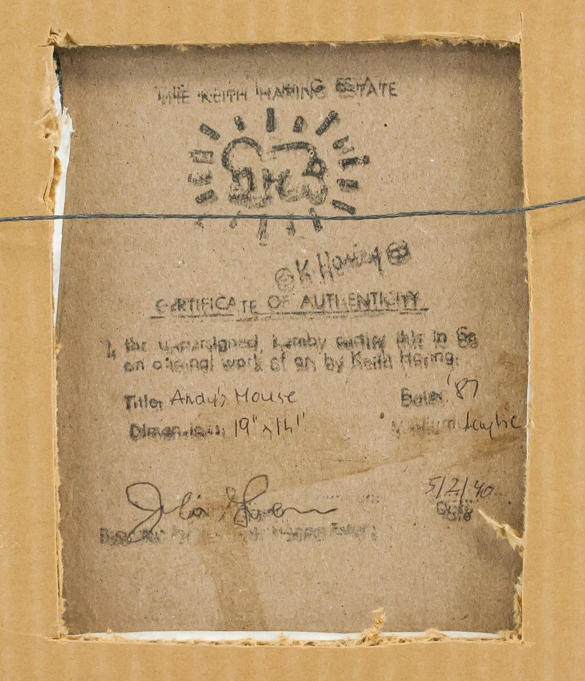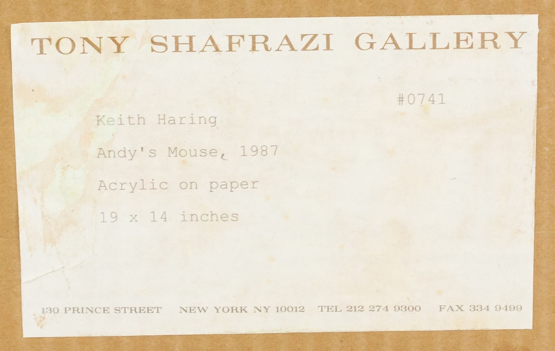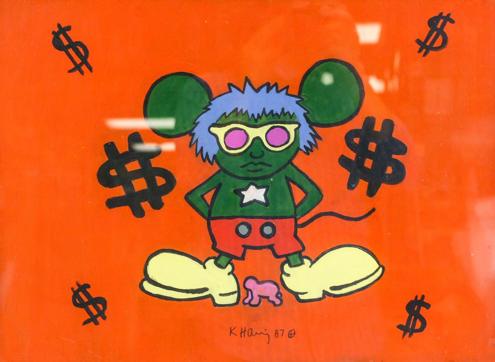 Acrylic on board, framed. Featuring a green Mickey Mouse-like figure with blue hair and yellow glasses. Dollar signs decorate the orange background. Signed "K. Haring" beneath the image. "KEITH HARING ESTATE CERTIFICATE OF AUTHENTICATION [illegible] hereby certify [illegible] an original work of art by Keith Haring. Title Andy's Mose Year '87 Dimensions 19' x 11' Acrylic 5/2/40" stamped and inscribed on verso. Sticker affixed to verso reads "TONY SHAFRAZI GALLERY Keith Haring Andy's Mouse, 1987 Acrylic on paper 19 x 14 inches #0741 130 PRINCE STREET NEW YORK NY 10012 TEL 212 274 9300 FAX 224 9499". Attributed to Keith Haring (1958-1990, American). Provenance: This lot carries limited provenance from a Private Toronto collection