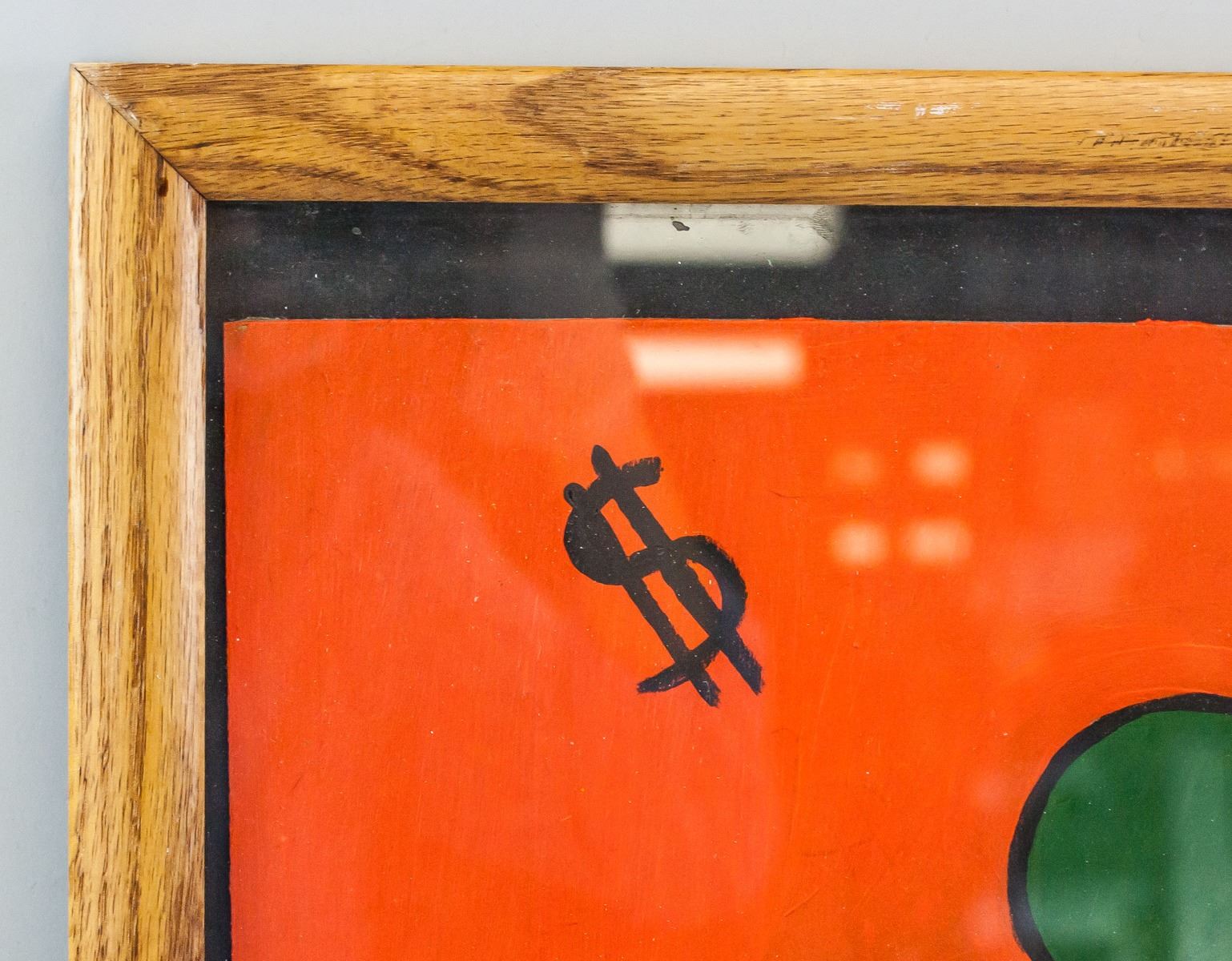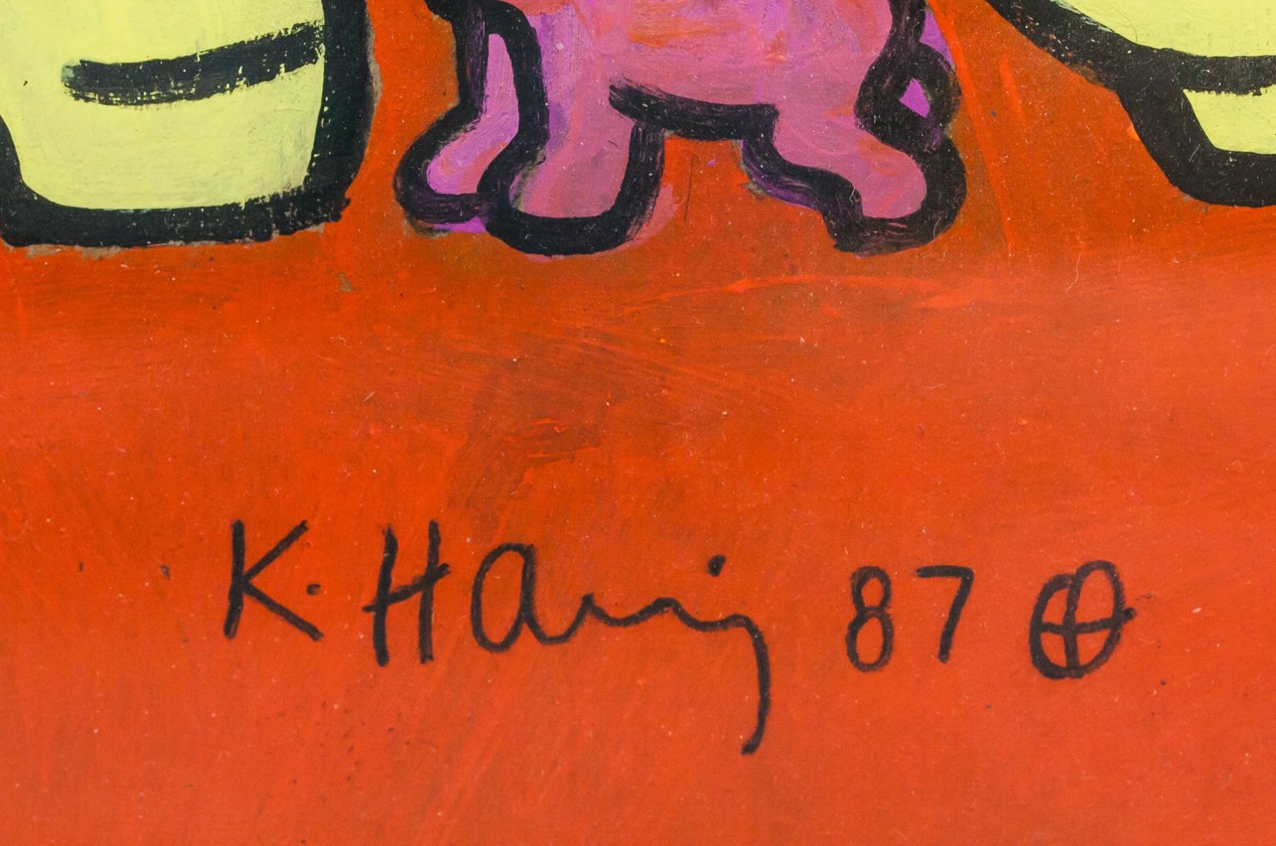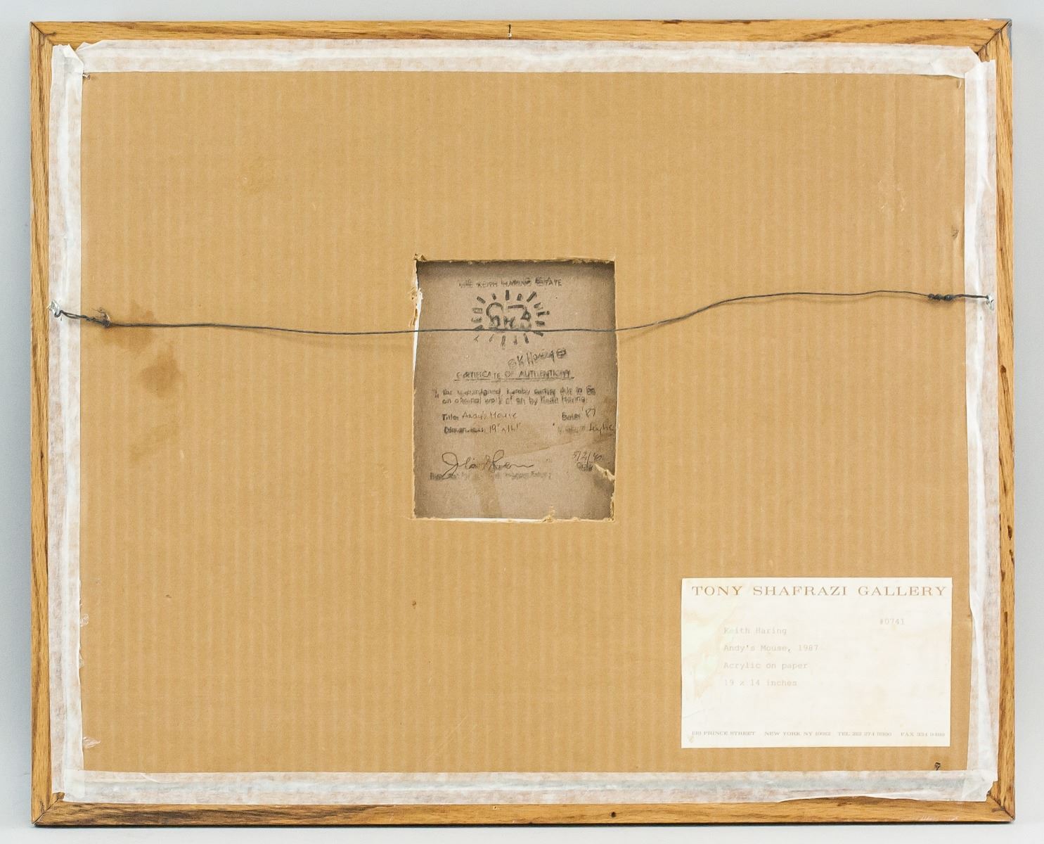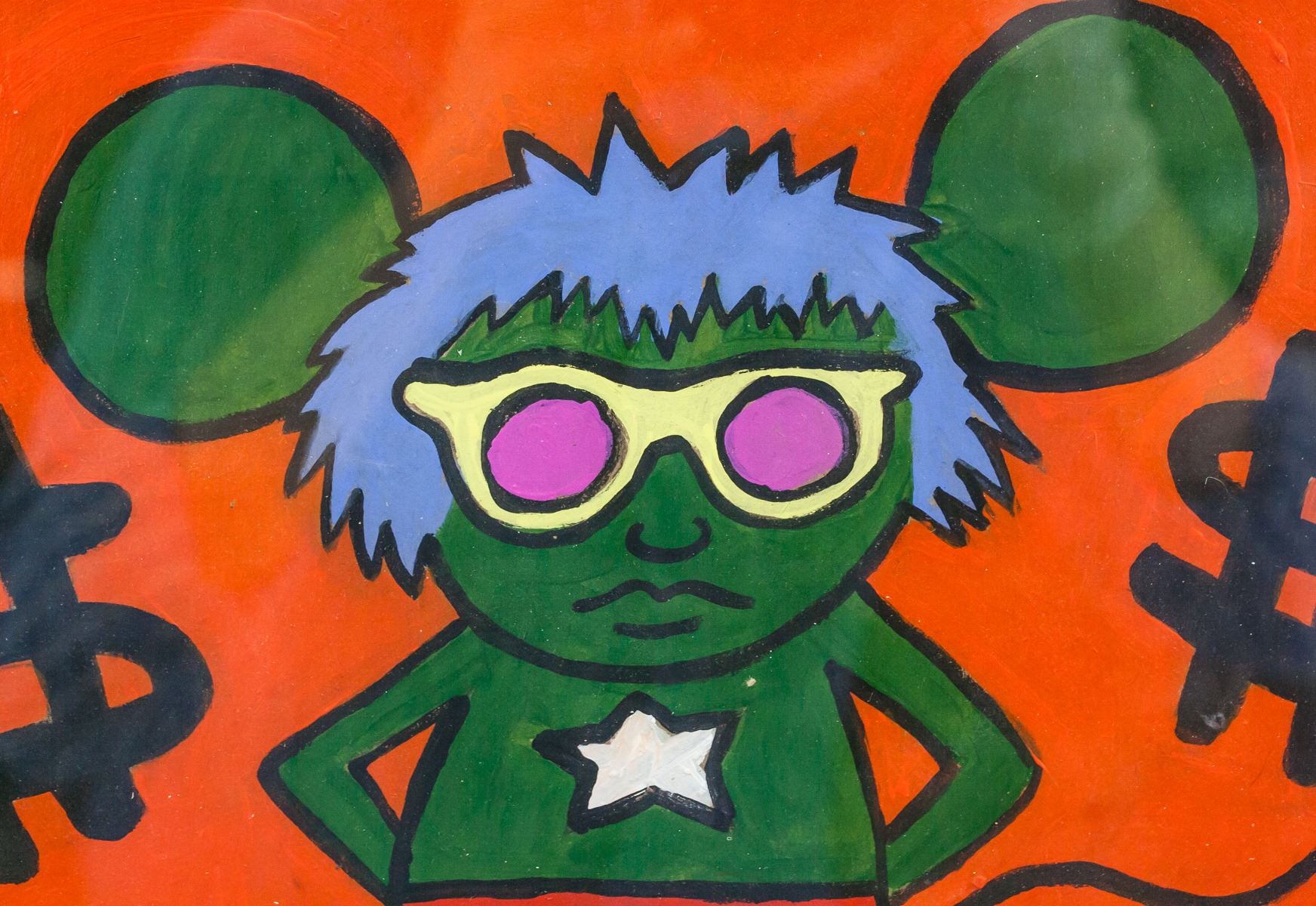 Acrylic on board, framed. Featuring a green Mickey Mouse-like figure with blue hair and yellow glasses. Dollar signs decorate the orange background. Signed "K. Haring" beneath the image. "KEITH HARING ESTATE CERTIFICATE OF AUTHENTICATION [illegible] hereby certify [illegible] an original work of art by Keith Haring. Title Andy's Mose Year '87 Dimensions 19' x 11' Acrylic 5/2/40" stamped and inscribed on verso. Sticker affixed to verso reads "TONY SHAFRAZI GALLERY Keith Haring Andy's Mouse, 1987 Acrylic on paper 19 x 14 inches #0741 130 PRINCE STREET NEW YORK NY 10012 TEL 212 274 9300 FAX 224 9499". Attributed to Keith Haring (1958-1990, American). Provenance: This lot carries limited provenance from a Private Toronto collection