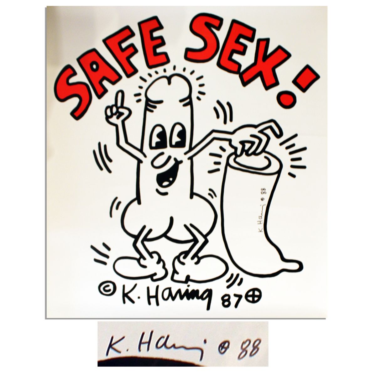 Pop artist Keith Haring signed poster of his famous illustrative painting ''Safe Sex!'' Drawn in typical Haring style, the poster was completed towards the end of his life in 1987. Poster is signed lengthwise ''K. Haring 88'' along with a drawn symbol of an encircled plus sign. Poster measures 27.25'' x 29.5''. Near fine condition.