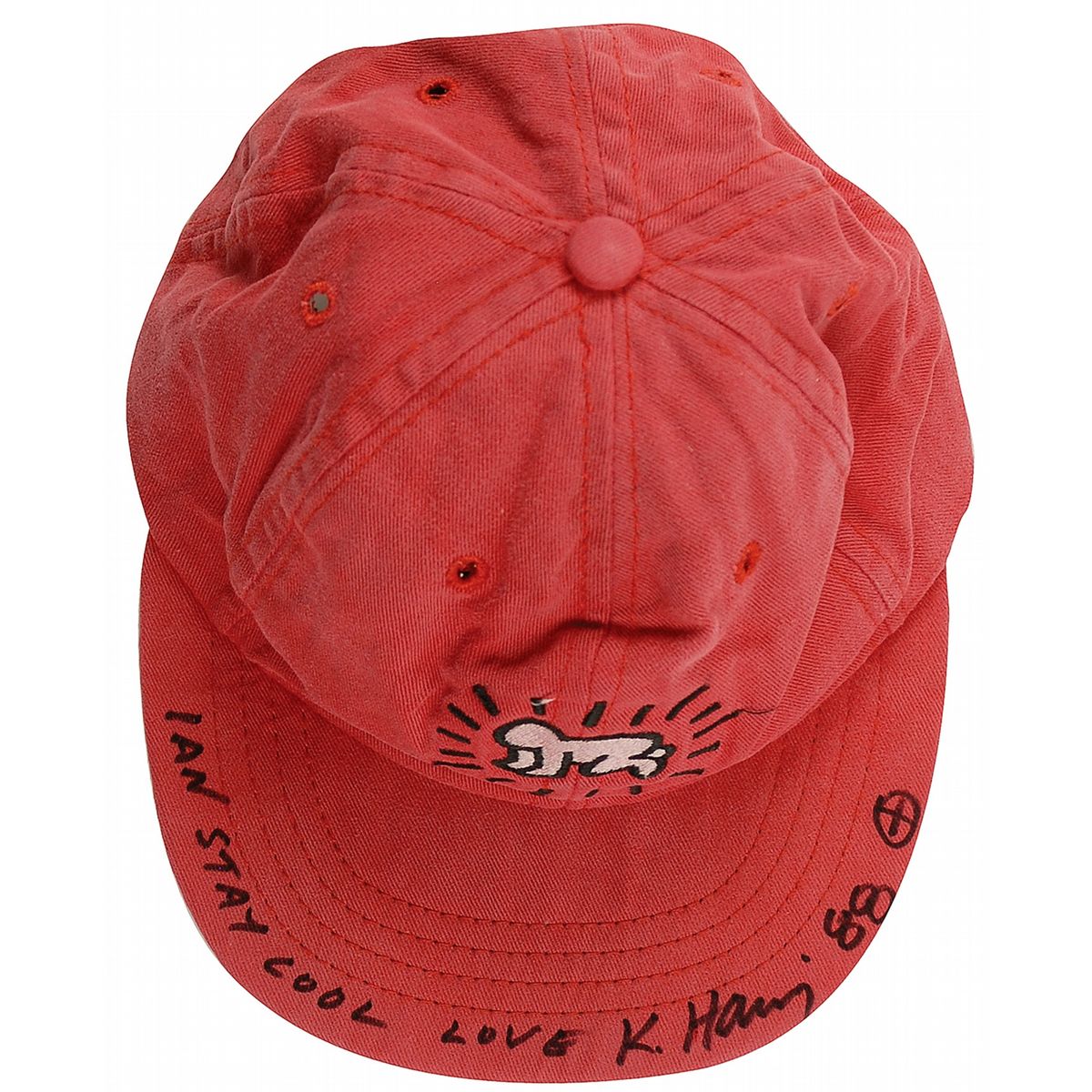 Red baseball cap, manufactured by Pop Shop, featuring an embroidered Haring figure on its hands and knees, signed and inscribed along the edge of the brim in black felt tip, “Ian, Stay cool. Love, K. Haring 88.” In fine condition.