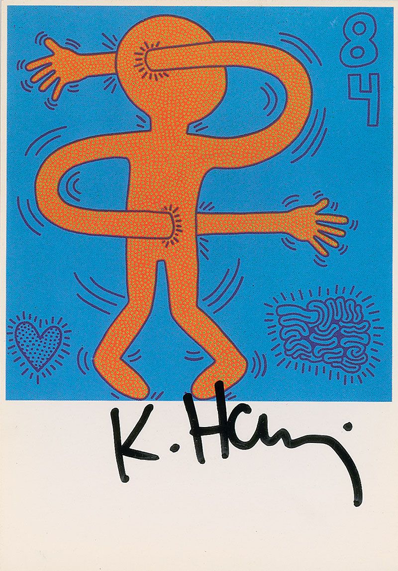 Interesting color 4 x 6 postcard of one of Haring’s untitled works from 1984, signed in the lower border in black felt tip, “K. Haring.” In fine condition.