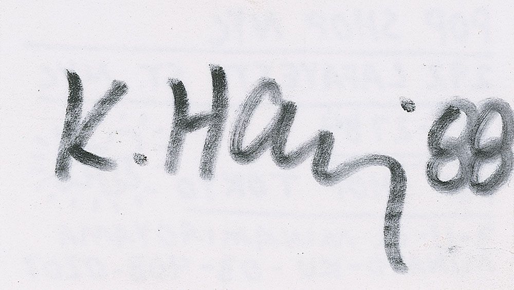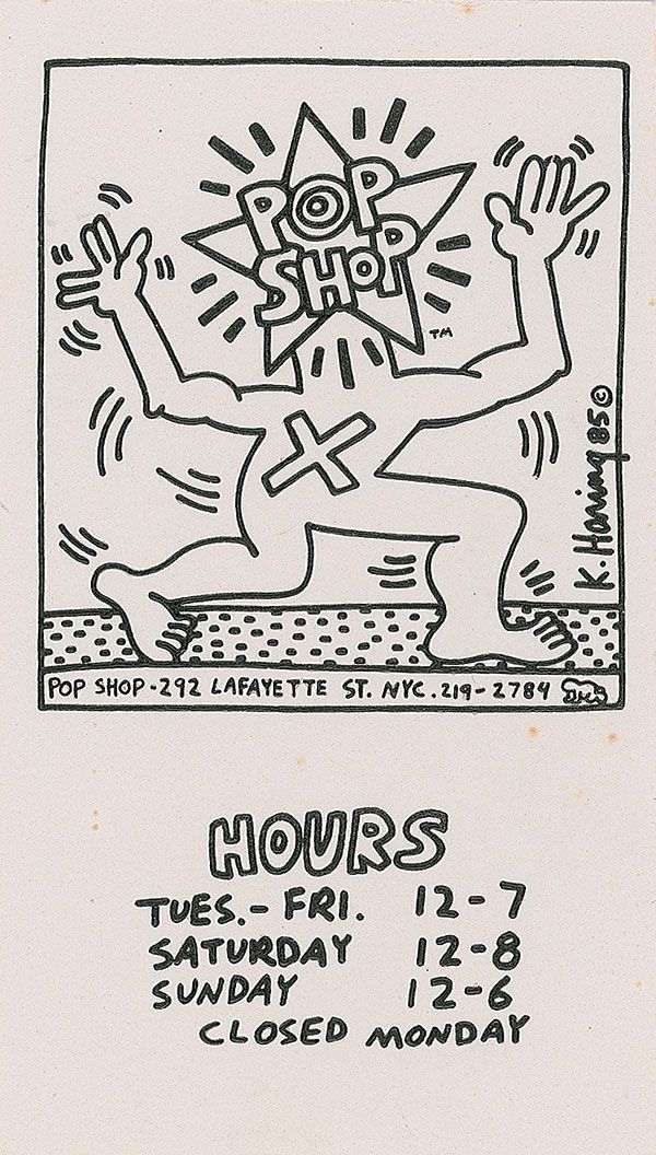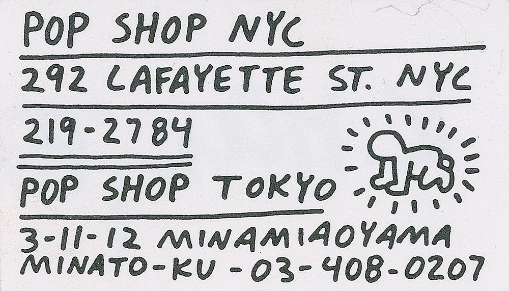 Two different Haring-designed business cards for his Pop Shop, one 2 x 3.5 and one 3.5 x 2, with the second one signed on the reverse in black felt tip, “K. Haring ‘88.” In fine condition.