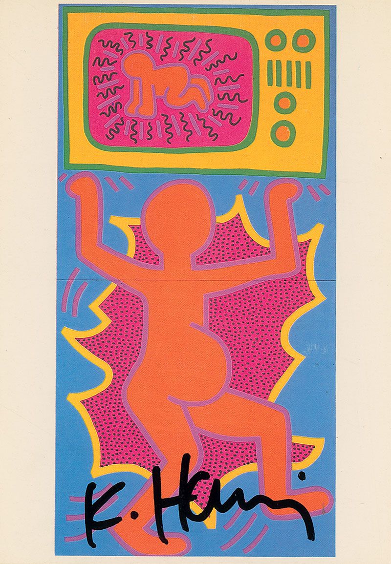Color 4 x 6 postcard with an untitled Haring work depicting a pregnant ‘Haring figure’ holding up a television, signed in person at the bottom in black felt tip, “K. Haring.” In very fine condition. Originally obtained by in-person specialist Mike Wehrmann.