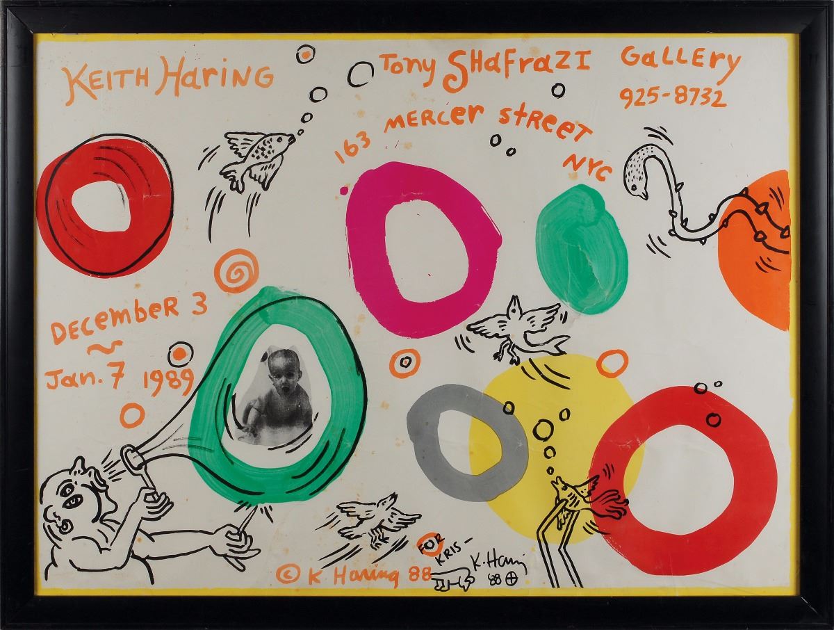Sought-after color 33.5 x 24.5 offset lithograph promoting a Haring exhibition at the Tony Shafrazi Gallery on January 7, 1989, signed and inscribed below in black felt tip, “For Kris–K. Haring, 88,” adding a sketch of one of his customary figures that incorporates a printed ‘8’ in the year as its head. Framed and in very good condition, with light foxing, moderate overall creasing, and a tear to the green circle not affecting any handwriting. Haring was diagnosed with AIDS the year he signed this lithograph. On the 20th anniversary of Haring’s death in February 2010, Shafrazi held an exhibition containing dozens of works from every stage of Haring's mature works.