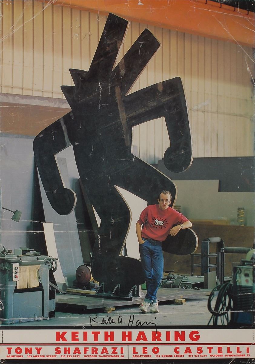 Scarce color 17 x 24 poster of Haring standing in front of a sculpture of one of his instantly recognizable works, signed in black felt tip, “Keith A. Haring.” Rolled and in very good condition, with tack holes to corners, two small pieces of clear tape on edges, an area of scuffing, and moderate-to-heavy creasing affecting appearance. Haring’s full signature is only the second we have ever seen.