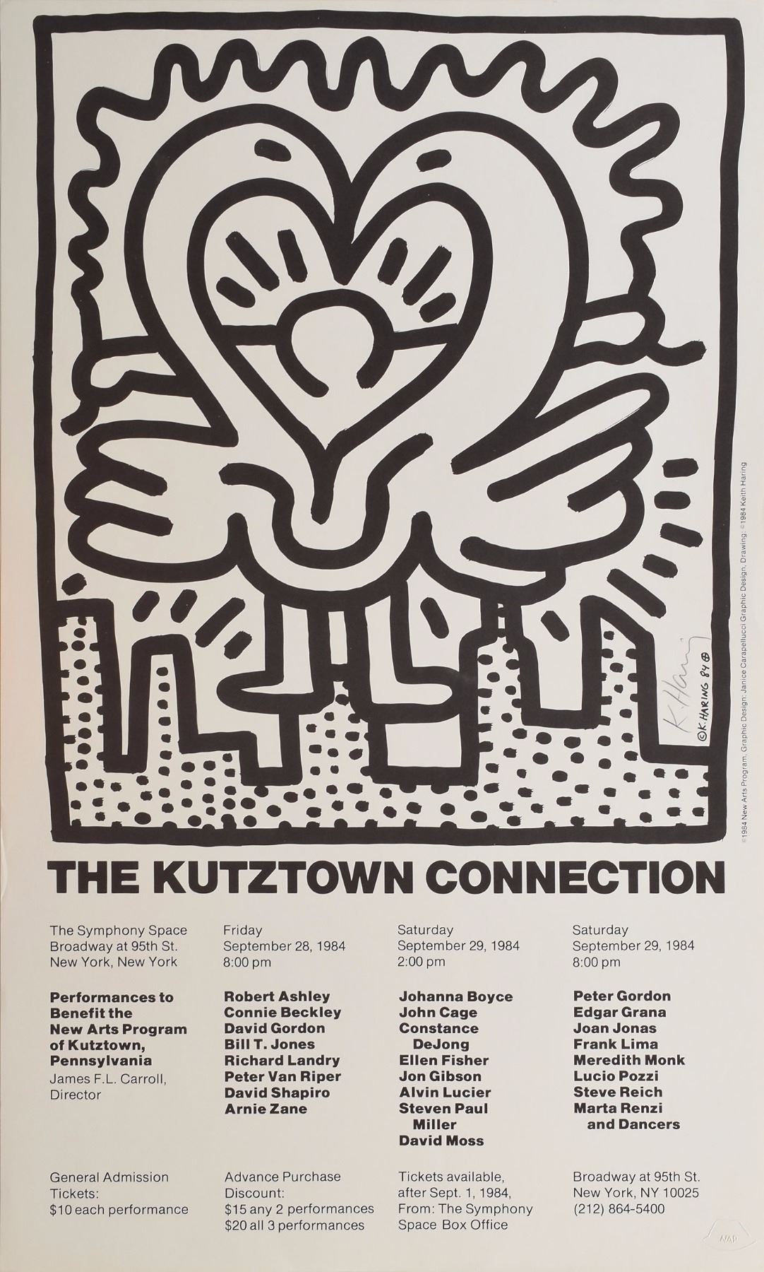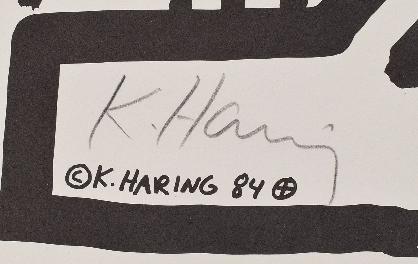 Lithograph published in 1984 by the New Arts Program entitled 'The Kutztown Connection,' 20 x 33, signed vertically on the right side in pencil, "K. Haring." Blindstamped "NAP" in the lower right. In fine condition, with a minor crease to the left edge. Accompanied by a mat for display.