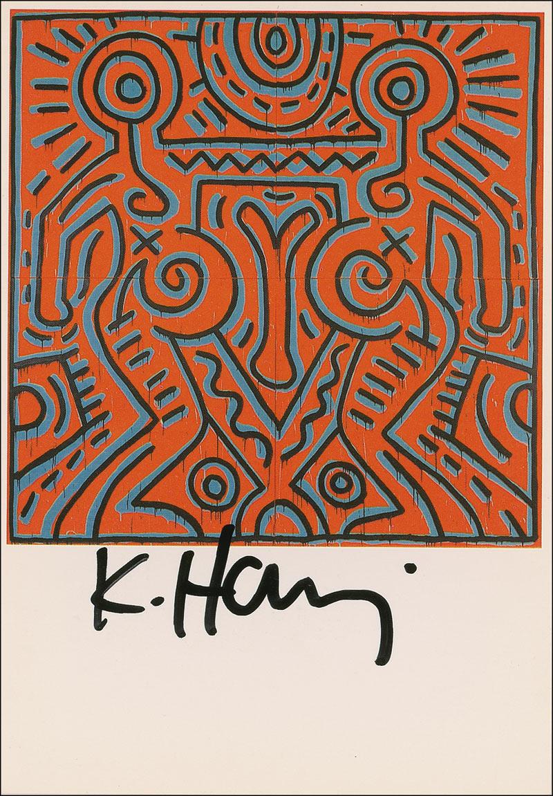 American artist (1958–1990) whose graffiti-inspired outline drawings of human figures and animals made him one of the most recognizable and ubiquitous figures in the 1980s art scene. Color 4 x 6 postcard photo of one of Haring’s untitled works, signed in the lower border in black felt tip, “K. Haring.” Originally obtained by in-person specialist Mike Wehrmann. In very fine condition. RRAuction COA.