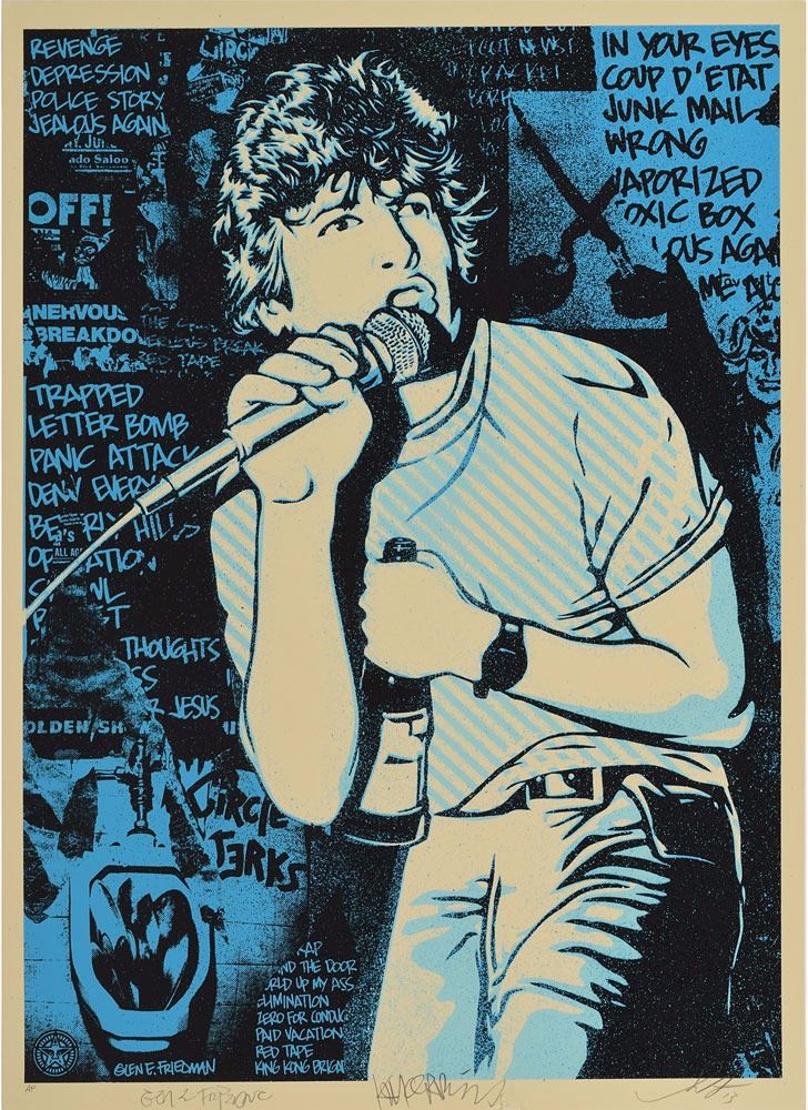 Attractive color 18 x 24 artist proof screen print of Circle Jerks frontman Keith Morris as he was originally photographed by Glen Friedman during a 1981 live performance, with song titles and the cover to Golden Shower of Hits as the background. Signed in the lower border by Morris, Friedman, and by the artist, Shepard Fairey, an influential contemporary street artist best known for his Obey clothing line and his 2008 Barack Obama 'Hope' poster design. In fine condition, with a small tear to bottom edge, near but not affecting Morris's signature. Morris collaborated with Fairey on the design and color scheme for this print; the background includes several of Morris's favorites songs from his three legendary punk and hardcore groups—Black Flag, Circle Jerks, and Off!—and the print's vibrant color was inspired by the work of Rick Griffin and John Van Hamersveld.