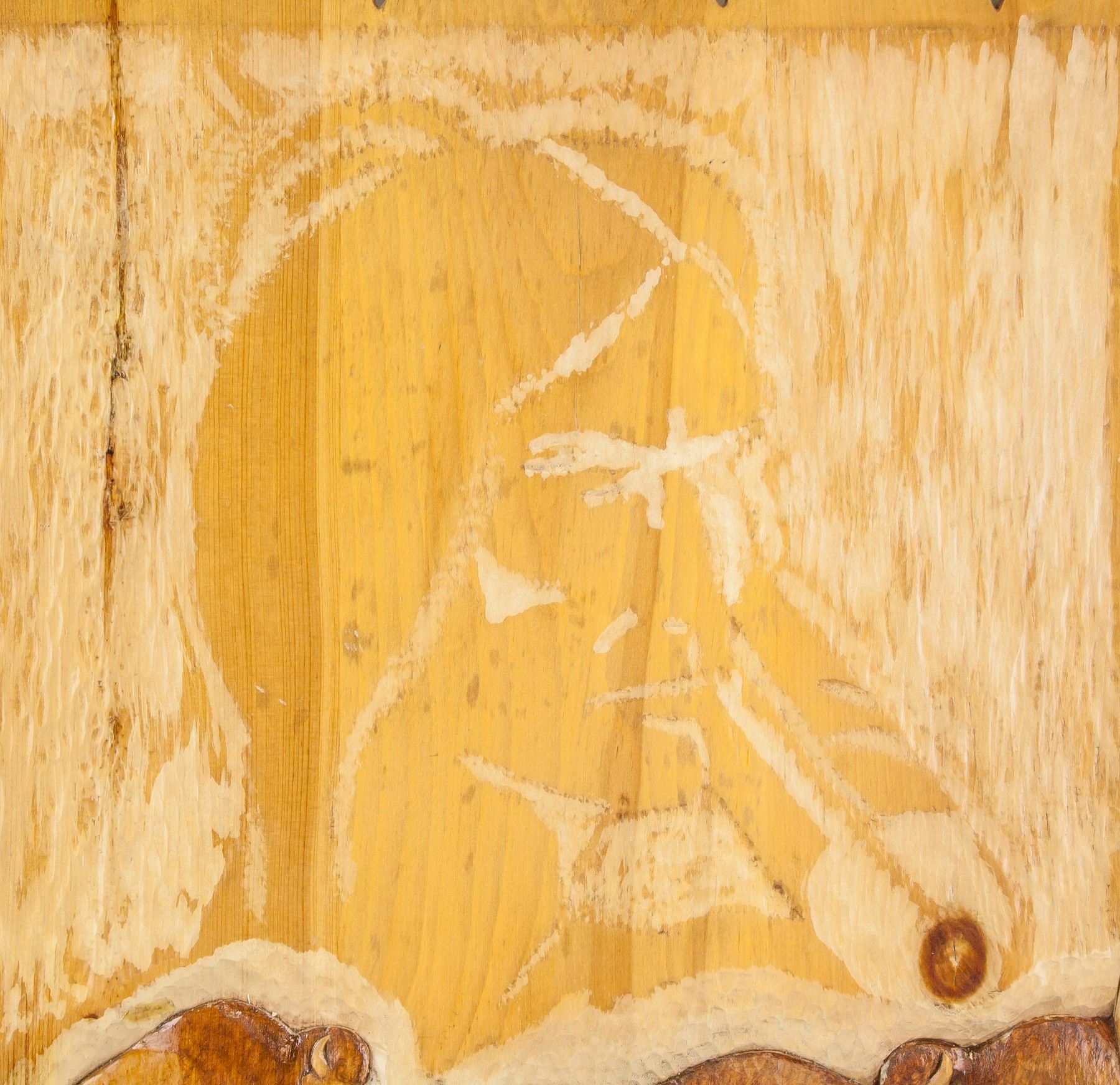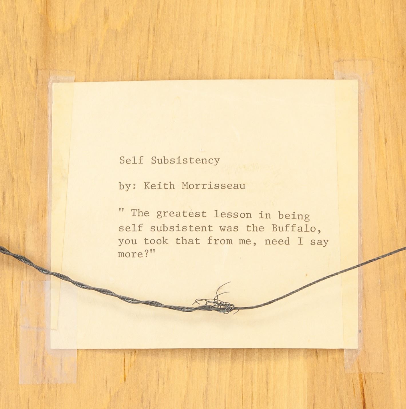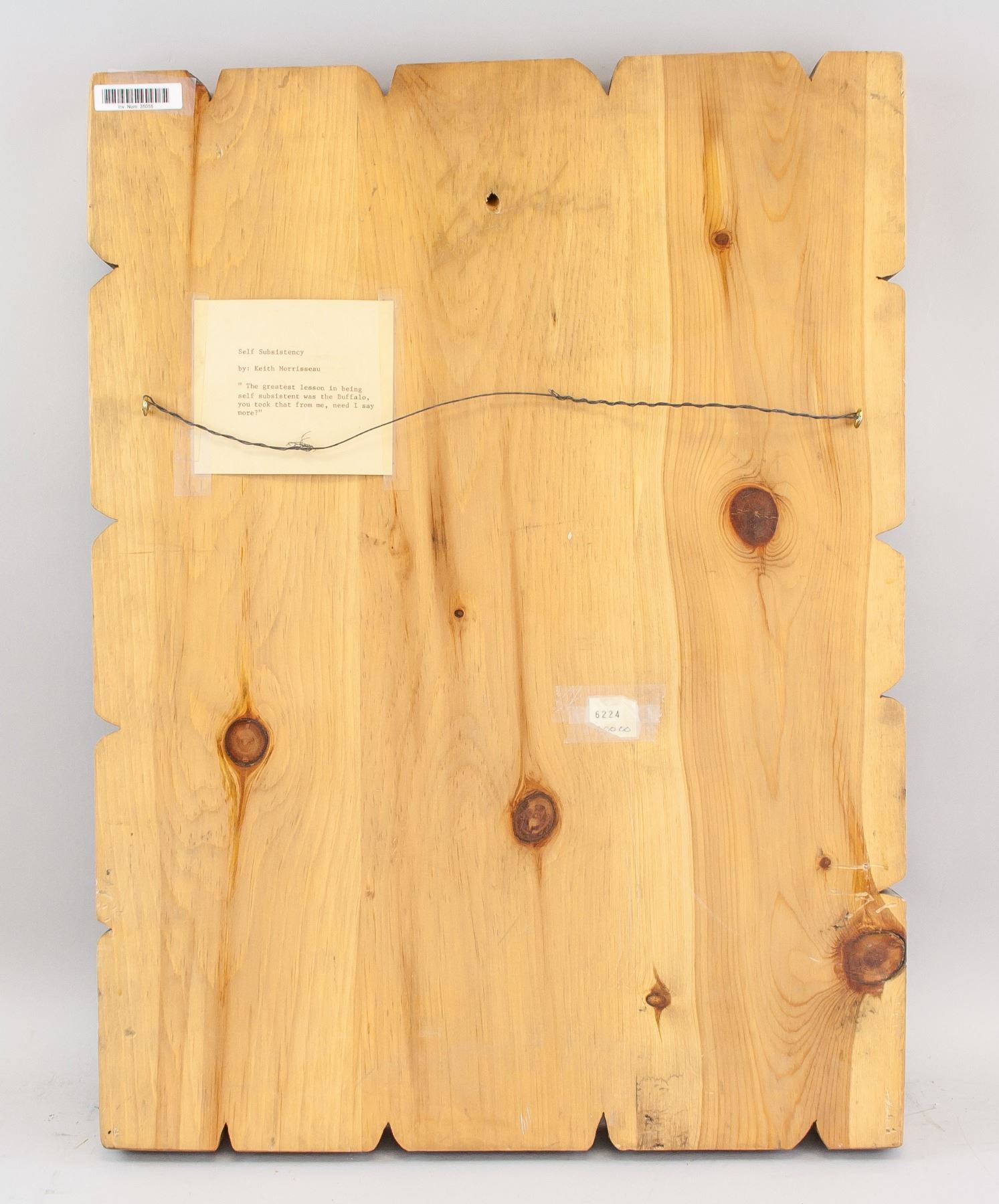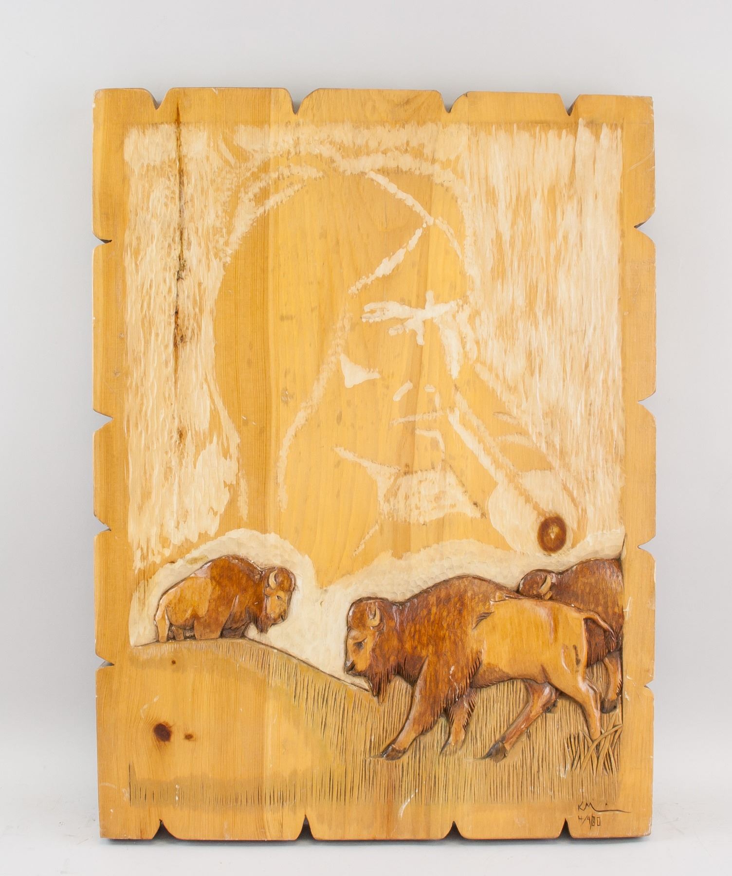 "Self Subsistency", low relief carving of buffalo on wood; signed Keith Morrisseau; dated 4/9/1980; with artist description on back "The greatest lesson in being self subsistent was the Buffalo, you took that from me, need I say more?"; 22 x 16 in (55.9 x 40.6 cm). PROVENANCE: Private collection, Montreal, QC