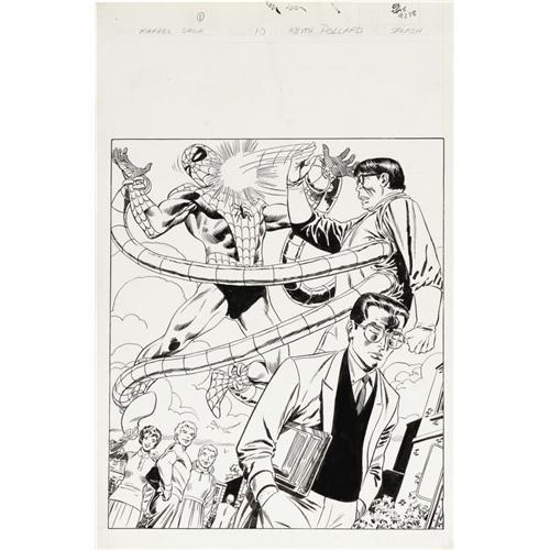 <B>Keith Pollard - The Marvel Saga #10, Splash page 1 Original Art (Marvel, 1986).</B></I> Outcast Peter Parker takes it on the masked chin from none other than Doctor Octopus, in this splash page from the tenth issue of <B>The Marvel Saga</B></I>, the Official History of the Marvel Universe. The image area measures 10" x 12". In Excellent condition.<BR><BR><b>Shipping:</b> Small Flat (<a target="_blank" href="http://www.heritageauctions.com/common/shipping.php">view shipping information</a>)