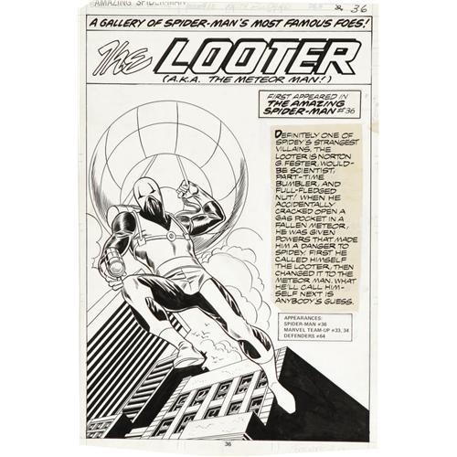 <B>Keith Pollard and Frank Giacoia - The Amazing Spider-Man Annual #13, Pin-Up page 36 Original Art (Marvel, 1979).</B></I> A meteor gave him powers that made him a danger to Spider-Man. Here's the Looter (a.k.a. the Meteor Man), one of Spidey's strangest villains, courtesy of penciler Keith Pollard and inker Frank Giacoia. This pin-up page from "A Gallery of Spider-Man's Most Famous Foes!" has an image area measuring 10" x 15". The bottom edge has been trimmed well outside of the image area, and there is some very light printer's oil staining at the upper right; otherwise the condition is Very Good.<BR><BR><b>Shipping:</b> Small Flat (<a target="_blank" href="http://www.heritageauctions.com/common/shipping.php">view shipping information</a>)