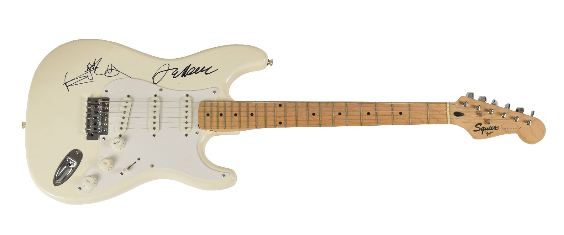 White-bodied Fender Squier Bullet Stratocaster electric guitar, signed on the body in black felt tip by Keith Richards and Jeff Beck. In very good to fine condition, with two repaired dings above Richards' signature, and an erasure to handwriting on the pickguard from testing the pen before signing.