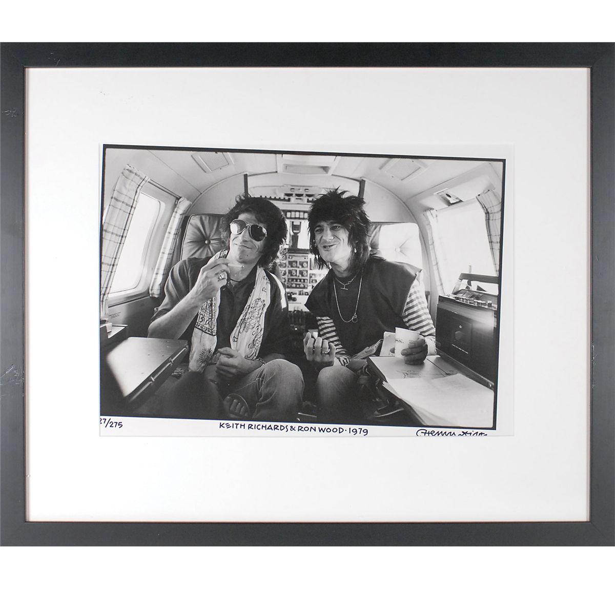 Limited edition silver gelatin print of Keith Richards and Ronnie Wood in their Lear jet, taken by Henry Diltz in 1979, 127/275, signed in the lower border in black felt tip by Diltz. Matted and framed to an overall size of 27.25 x 22.25. In fine condition. Provenance: Gerry Harrington.