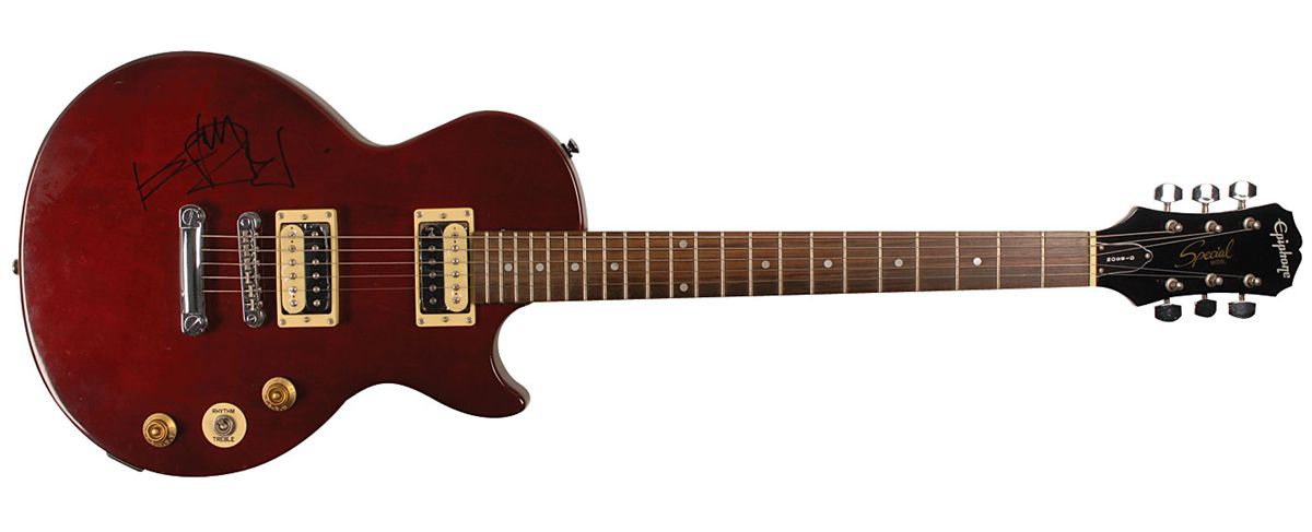 Red-bodied Gibson Epiphone Special model electric guitar, signed in-person on the body in black felt tip. In fine condition, with a bit of light wear to body above the signature and one string missing. Originally obtained by in-person specialist Mike Wehrmann.