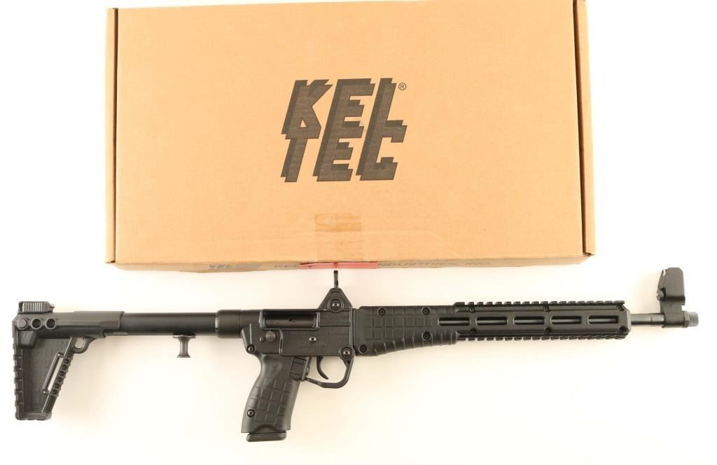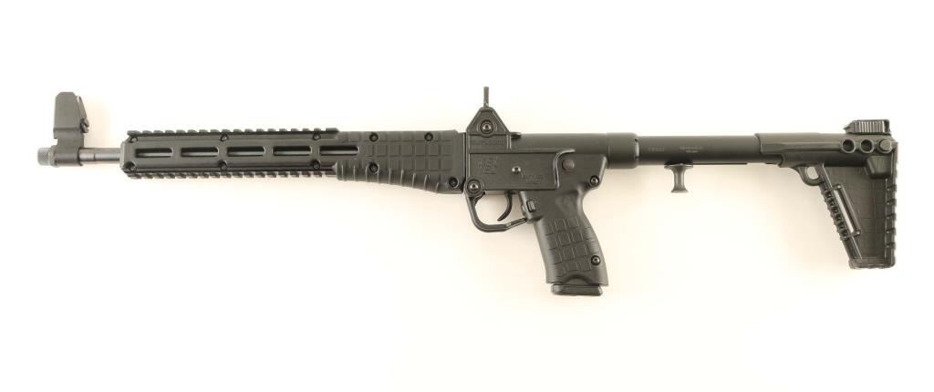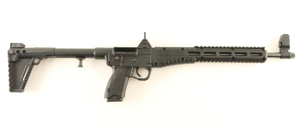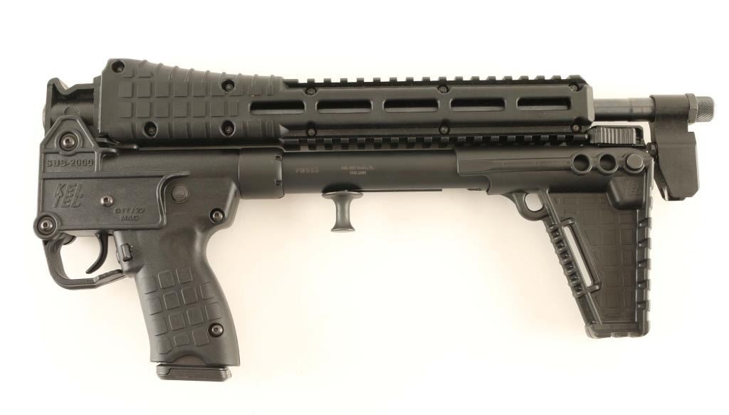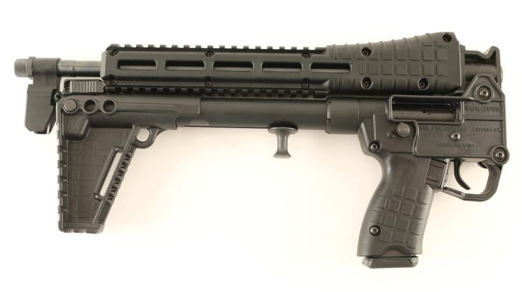 Semiautomatic carbine features hinge at receiver front to allow folding in half for convenient storage or transport, accepts Glock 17 style magazines, approx 16" barrel with threaded muzzle, muzzle thread protector, Picatinny rail on top and bottom of handguard, adjustable sights, manual safety, detachable magazine in grip, sling slot at butt. Bore is excellent. Barrel is blued, few signs of handling. Black polymer parts are excellent. Includes one magazine and original factory cardboard box with manual. Condition is NRA Excellent - Like New *** Modern Firearm ***