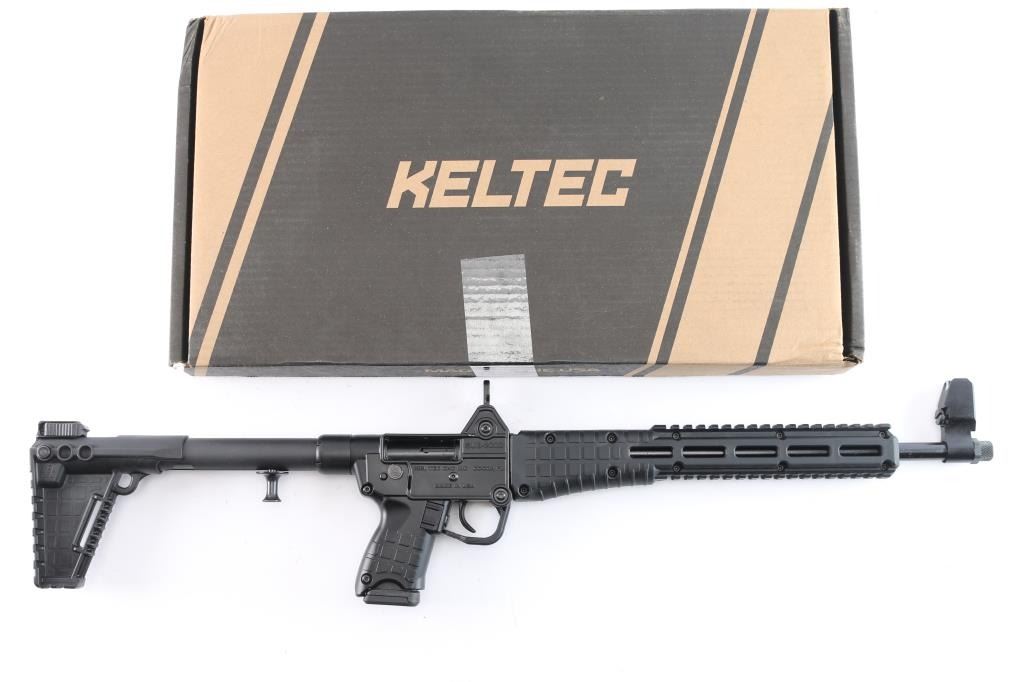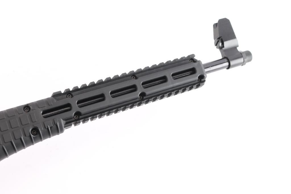 American made semi-automatic blowback centerfire carbine chambered for 9x19mm, manufactured in Cocoa, FL. Introduced to the market in 2000, this rifle can be folded up into a neat package and fit into reasonable sized carrying cases, that don't look like a gun case. This second generation (introduced in 2015) rifle features a 16.25" barrel with a threaded muzzle and thread protector, elevation and windage adjustable post front sight, fixed aperture rear sight, smooth curved trigger, charging handle on stock tube, utilizes Glock 19 or Glock 23 magazines, push-button magazine release, manual bolt hold open, and annular cut manual push-button safety. The black synthetic furniture consists of a picatinny accessory rail on top and bottom of the forend, a sling slot at square textured adjustable buttstock, M-Lok rails on the left and right side of the square textured forend, and square texturing on the pistol grip. To fold carbine in half for storage or travel, the trigger guard acts as a latch. The original black plastic finish retained is approximately 99% with nothing remarkable. Metal displays no rust or deformation. Bore is bright with strong rifling, and the action is smooth and crisp. Rifle includes the original factory cardboard shipping box with manual, and stickers.