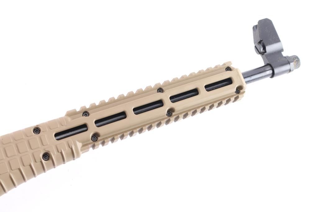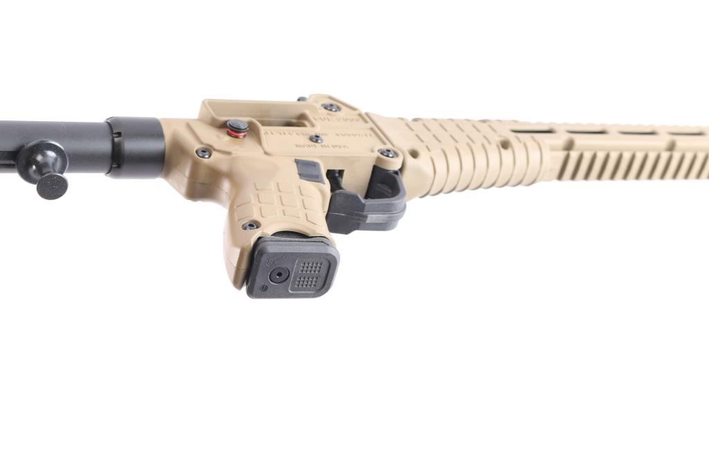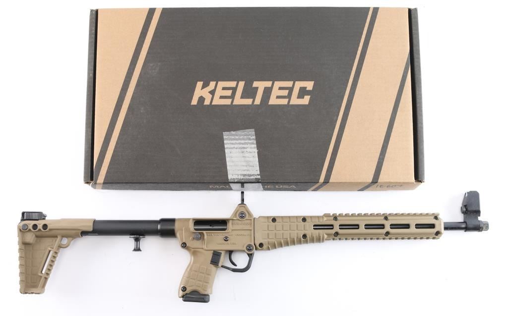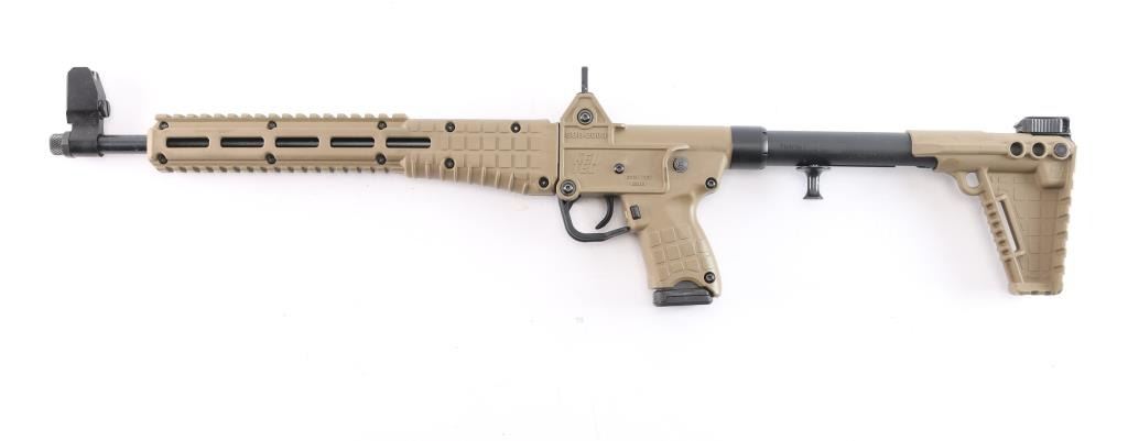 American made semi-automatic blowback centerfire carbine chambered for 9x19mm, manufactured in Cocoa, FL. Introduced to the market in 2000, this rifle can be folded up into a neat package and fit into reasonable sized carrying cases, that don't look like a gun case. This second generation (introduced in 2015) rifle features a 16.25" barrel with a threaded muzzle and thread protector, elevation and windage adjustable post front sight, fixed aperture rear sight, smooth curved trigger, charging handle on stock tube, utilizes Glock 19 or Glock 23 magazines, push-button magazine release, manual bolt hold open, and annular cut manual push-button safety. The Flat Dark Earth (FDE) synthetic furniture consists of a picatinny accessory rail on top and bottom of the forend, a sling slot at square textured adjustable buttstock, M-Lok rails on the left and right side of the square textured forend, and square texturing on the pistol grip. To fold carbine in half for storage or travel, the trigger guard acts as a latch. The original FDE plastic finish retained is approximately 99% with nothing remarkable, but there is oil on the rifle, making it look discolored. Metal displays no rust or deformation. Bore is bright with strong rifling, and the action is smooth and crisp. Rifle includes the original factory cardboard shipping box with manual, and stickers.
