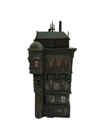 Hand crafted whimsical building that made up an entire town. The model town created all of the backgrounds for the entire music video with the artist Kelis shot separately and composited into the scenes. Designed by New Deal Studios co-founder Ian Hunter with the mandate that the buildings feel like they would exist in a "Tim Burton" world. Fabricated from wood, styrene, stucco and resin castings. 18" long x 40" tall. Ratio 1:24.