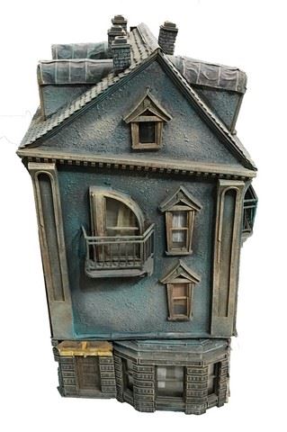 Hand crafted whimsical building that made up an entire town. The model town created all of the backgrounds for the entire music video with the artist Kelis shot separately and composited into the scenes. Designed by New Deal Studios co-founder Ian Hunter with the mandate that the buildings feel like they would exist in a "Tim Burton" world. Fabricated from wood, styrene, stucco and resin castings. This particular building was built by Ian Hunter. 16" long x 28" tall. Ratio 1:24.