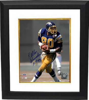Kellen Winslow is widely recognized as one of the greatest tight ends in the history of the game. He led the NFL in receptions in 1980 and 1981, becoming the first tight end ever to lead the league in receptions in back to back seasons. He also exceeded the 1,000 yards receiving milestone in 3 different seasons, including setting a single season record for receiving yards (a record that still stands) by a tight end with a whopping 1,290 yards in the 1980 season. In a 1981 regular season game, Winslow tied an NFL record by catching five touchdown passes. Winslow played in five Pro Bowls, was elected to the Pro Football Hall of Fame in 1995. Kellen Winslow, Sr. has hand autographed this San Diego Chargers 8X10 Photo with HOF 95 Inscription. MAB Hologram and Certificate of Authenticity from Athlon Sports Collectibles. Custom White Mat and Premium Black Color Framed as shown.