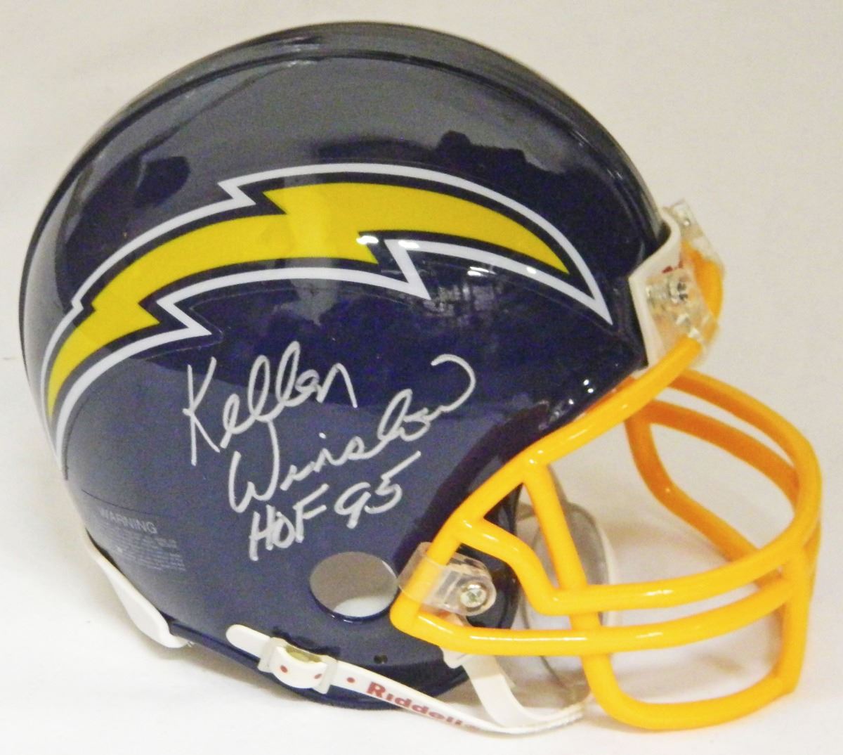 Kellen Winslow signed San Diego Chargers throwback navy Riddell mini helmet with 'HOF 95' inscription. Item comes with a Schwartz Sports Memorabilia tamper-proof numbered hologram which can be verified online.