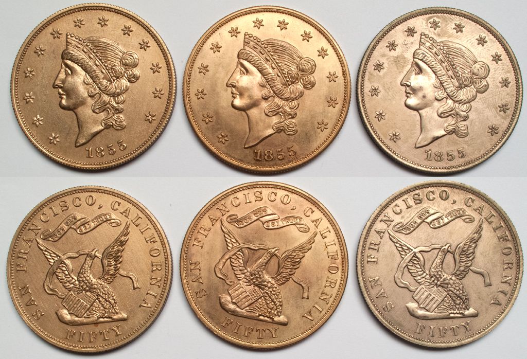 Three Kellog $50 round slug facsimiles. Obverse within a beaded border the head of Liberty facing left wearing a coronet and surrounded by 13 stars. The date 1855 is clearly visible below. Reverse says 'San Francisco, California' with 'Fifty' below. Eagle in the center on a rock with a ribbon in beak and banner above '1809 GRS' and '887 THOU.' Sold by coin dealer Earl Parker in the 1940's and 50's in San Francisco. Bill Weber Collection. City: San FranciscoCounty: State: CADate: c1950