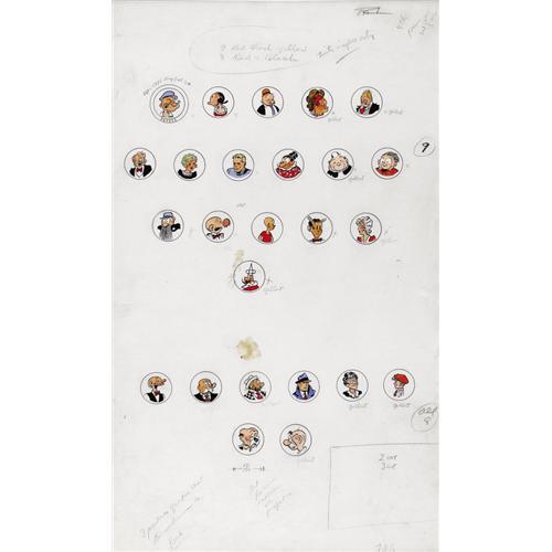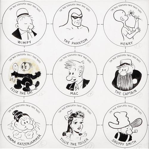 <B>Kellogg's Pep Comic Character Pins Original Art (Kellogg's, 1946).</B></I> Collectors who grew up in the post World War II-era well remember the small-sized comic character pinback buttons found inside boxes of Pep cereal, back in the mid-late 1940s. Heritage is offering a complete set of these tiny treasures elsewhere in this auction, but here's something really unusual - the original artwork used to produce nine of the buttons, plus a large sheet of color "mock-ups" of twenty-five different character designs! The original art for pins #10-18 features drawings of two of the most sought-after pin designs, Felix the Cat and the Phantom, as well as Wimpy, Henry, Mac, the Captain, Mama Katzenjammer, Tillie the Toiler, and Snuffy Smith. The Felix art had a pasted-over correction that has partially fallen off, but the other items are all in Excellent condition. Each circular design measures 3", and all type was hand-lettered. This piece is attractively matted for an overall size of approximately 12.5" x 12.5", ready to frame; also included is the matted original tissue overlay, marked for color. The color mock-up art is also matted, to an overall size of approximately 14" x 22", and is in Very Good condition. <BR><BR><B>Important notice:</B> Heritage usually auctions material at the rate of 200-250 lots per hour. On some occasions eBay Live bid software or the Internet may not be able to keep up with the pace of the auction. We recommend placing a realistic absentee bid now as insurance to avoid disappointment. Occasionally the auctioneer may eliminate or reject an eBay Live bid, and the auctioneer may also reopen a lot after the close of the eBay live bidding (usually because we missed an audience bid), and may reject your bid even if it shows you as the winning bidder. By bidding via eBay Live, you agree that Heritage may award the lot to another bidder at its sole discretion under the circumstances described above or any other reasonable circumstances. Since eBay bids are not shown to us until we open the lot on the floor, we treat those bids just like floor bids. In most cases the floor responds before the eBay bid is presented to us, due to Internet lag time, so for consistency we have made it a policy that floor bids are always considered first over tie eBay live bids. Also please note that all Heritage lots purchased through eBay Live carry a 22.5% Buyer's Premium. Please make sure you read the Terms and Conditions before you bid. This lot is being auctioned in conjunction with a live floor auction by Heritage Auction Galleries. All final auction and invoice information will be supplied by Heritage Auction Galleries, and all other information should be considered preliminary. Lot:41001 <BR><BR><B>Winning Notification and Billing:</B> After the FINAL session in this auction is complete, Heritage will send e-mail and snail mail invoices. This process normally takes several days. All final auction and invoice information will be supplied by Heritage Auction Galleries, and all other information should be considered preliminary. <BR><BR>This auction will be conducted on a live auction floor and over the Internet through eBay Live. If you choose to place an absentee bid, please take a moment to <font color='#0000ff'><u><a href='http://pages.ebay.com/liveauctions/help/before/laabsentee.html'>learn how eBay Live absentee bidding works</a></u></font><font color='#000000'>