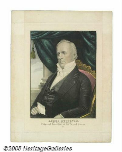 <B>Kellogg Campaign Print for James Buchanan</B></I> 13" x 17" hand-colored, small-folio lithograph published by Kellogg in Hartford in 1856, titled "James Buchanan, The Democratic Candidate for Fifteenth President of the United States." Old Buck is seated in the presidential chair, holding a small document, looking rather dour, beneath tasseled draperies. Colors include emerald, yellow, orange and pink. Condition is quite nice, especially considering the rarely encountered full margins. Lot:256