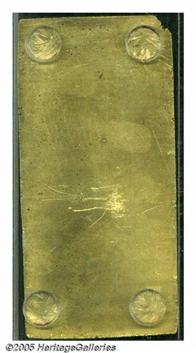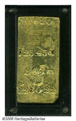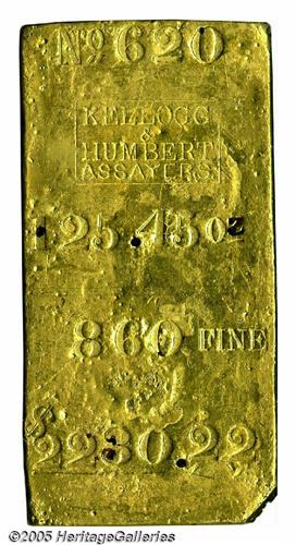 <B>Kellogg & Humbert Assayers Gold Face Plate.</B></I> No. 620. This is one of the gold ingots that was sliced lengthwise for its gold content and then the gold was made into the Kellogg proof restrikes a couple of years ago. This particular bar has the individual number 620 at the top of the front side, followed by the firm's imprint, then 125.45 Oz, 860 FINE, and finally the value $2230.22.