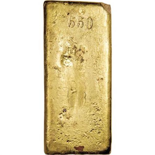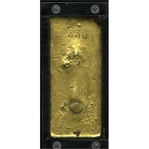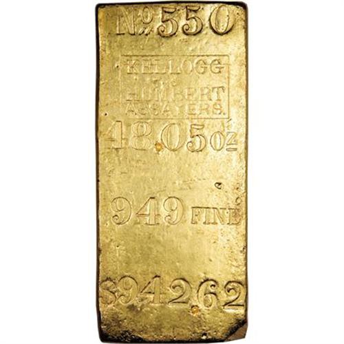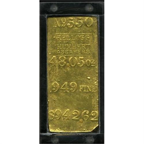 <B>Kellogg & Humbert Gold Ingot. 48.05 Ounces.<BR><BR></B></I> While gold ingots may have existed at one time from the gold rush in the Southeast, none appear to have survived today. Gold ingots are almost exclusively a phenomenon of Gold Rush California, brought about by the enormous quantities of the metal flakes found in the northern part of the state. Ingots such as this one from Kellogg & Humbert are primarily transport bars that concentrated a large store of value in a form that could essentially be used as money. In quantities such as this, the value was in excess of what could be used in the channels of commerce: Who has change for $942.62? Thus, the value of these ingots was in transferring large amounts of gold to a major financial center (such as New York). It was also imperative that everyone who handled such an ingot had faith that the value stamped on it was accurate. And that is where the reputation of Kellogg & Humbert played such an important role.<BR> Gold Rush California had numerous private assayers and coiners in the early 1850s. But publication of the slim volume <I>Gold and Silver Coins</B></I> (1851)<I> </B></I>by Jacob Eckfeldt and William Du Bois revealed that many of these private companies were not issuing coinage of full intrinsic value. These companies were soon out of business and their coins were melted when found. John Kellogg and Augustus Humbert (U.S. Assayer) maintained the highest standards of quality in their assaying operations, both singly and in partnership. This last fact explaining the large number and significant value of the gold ingots that were lost with the sinking of the <I>S.S. Central America</B></I>.<BR> This is an attractive, well-impressed ingot. The top side reads: No 550 / Kellogg & Humbert imprint / 48.05 Oz / 949 FINE / $942.62. The individual ingot number is repeated at the top of the back side, and the usually seen assay chips are out of opposing corners. Bright yellow-gold color throughout, the only spot of the often-seen reddish patina is located at the bottom of the back side. Included with the lot is the massive reference book by Q. David Bowers, <I>A California Gold Rush History, </B></I>and a facsimile treasure chest with red velvet interior is included with the lot. 44 x 99 x 20 mm.<BR><I>From The Arroyo Grande Collection.</B></I><BR><BR><b>Shipping:</b> Coins & Currency (<a target="_blank" href="http://www.heritageauctions.com/common/shipping.php">view shipping information</a>)