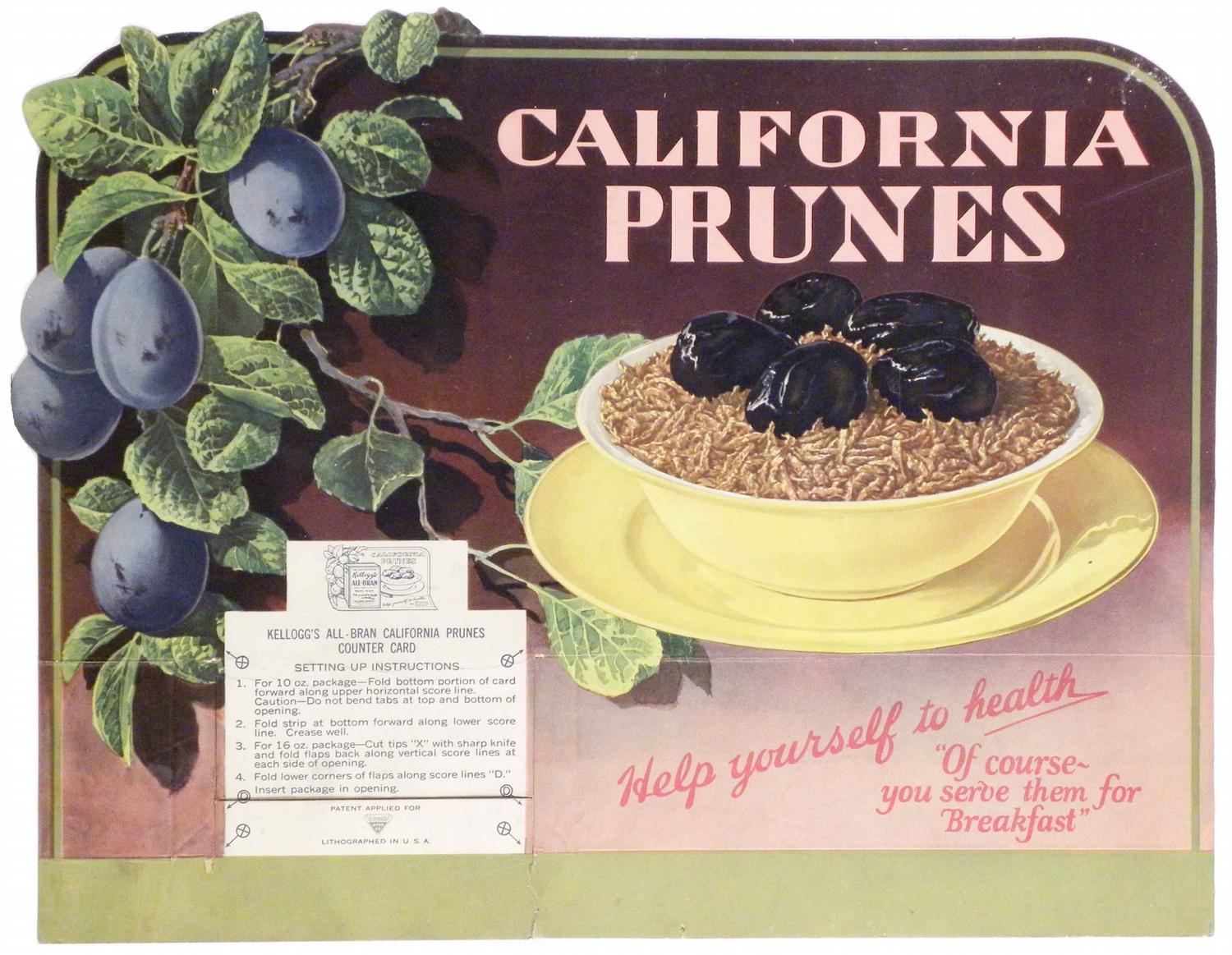 Kellogg's All-Bran California Prunes Die Cut Cardboard Counter Card for product display. A fold at 7:00 and scuff mark at 1:00 otherwise excellent condition. 18 X 14 inches.