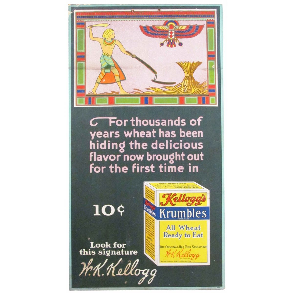 Kellogg's Krumbles Cereal Cardboard String Hanger Sign. Copyright 1916 by Kellogg Toasted Corn Flake Co. Egyptian motif. Very minor staining and a couple of holes otherwise good condition. 11 1/4 X 20 3/4 inches.