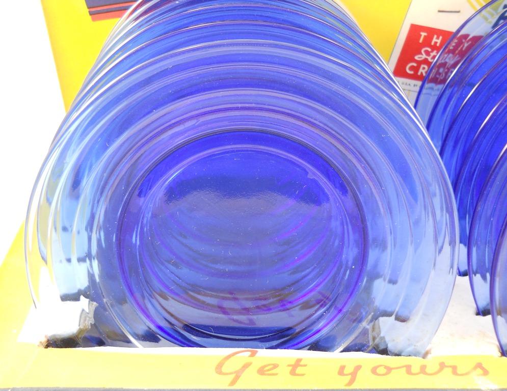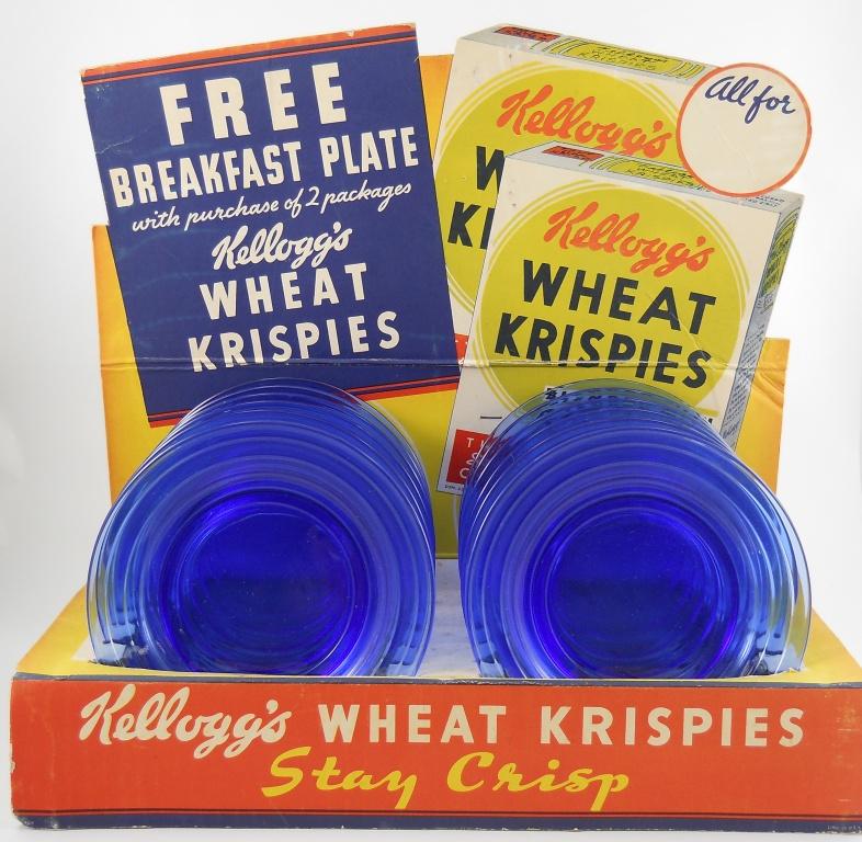 This is a store display dated 1935, showing the blue plates that came in your box of Kellogg's Wheat Krispies. The display is holding 12 plates, each being 7 inches in diameter. The display itself is 16-1/2 inches wide x 8-1/2 inches deep x 16 inches tall.