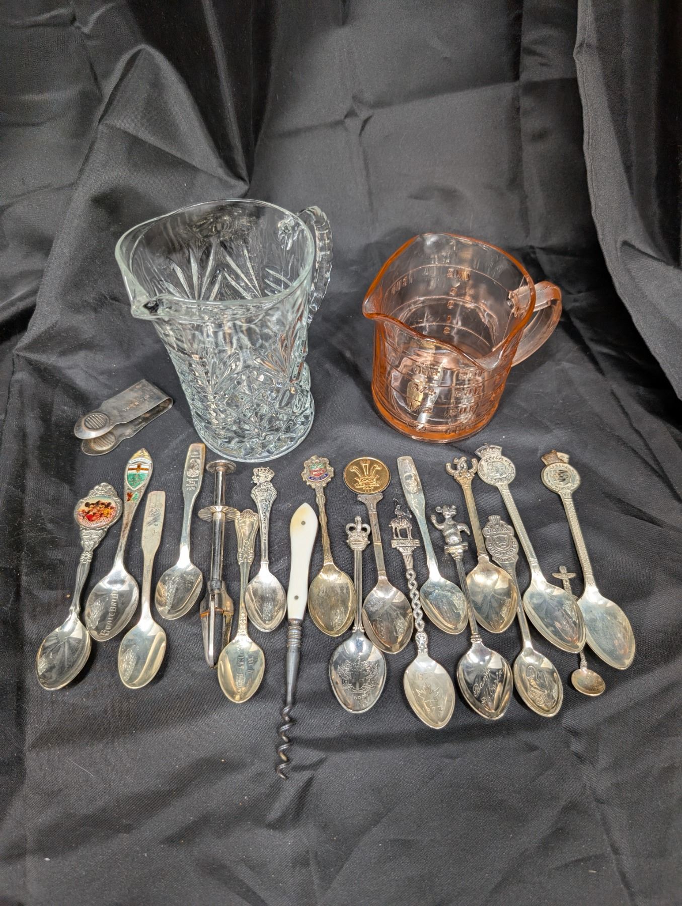 Kellogg's measuring cup/Glass cream pitcher with utensils