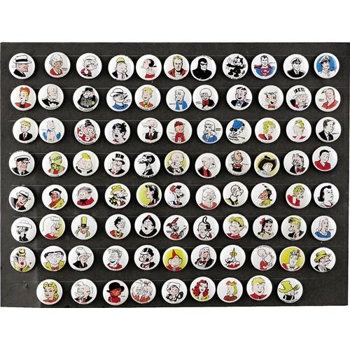 <B>Kelloggs Comic Character Pep Pins Complete Set of 86 (Kellogg's, 1945-47).</B></I> During the post war years of 1945 through 1947, children all over America eagerly consumed bowls of Kellogg's Pep cereal, in search of these wonderful little pinback buttons. Many a beanie cap would be decorated with these 13/16" treasures during this time, and completing the set became the goal for many a youngster. Now you can relive those happy times, and without eating another spoonful of cereal - all with one winning bid! This set includes all 86 different designs, including the hard-to-find Felix the Cat and Phantom pins, and all are in like-new Excellent condition! The set comes ready to frame in an attractive mat measuring 16" x 13.25". Not listed in Overstreet. <BR><BR><B>Important notice:</B> Heritage usually auctions material at the rate of 200-250 lots per hour. On some occasions eBay Live bid software or the Internet may not be able to keep up with the pace of the auction. We recommend placing a realistic absentee bid now as insurance to avoid disappointment. Occasionally the auctioneer may eliminate or reject an eBay Live bid, and the auctioneer may also reopen a lot after the close of the eBay live bidding (usually because we missed an audience bid), and may reject your bid even if it shows you as the winning bidder. By bidding via eBay Live, you agree that Heritage may award the lot to another bidder at its sole discretion under the circumstances described above or any other reasonable circumstances. Since eBay bids are not shown to us until we open the lot on the floor, we treat those bids just like floor bids. In most cases the floor responds before the eBay bid is presented to us, due to Internet lag time, so for consistency we have made it a policy that floor bids are always considered first over tie eBay live bids. Also please note that all Heritage lots purchased through eBay Live carry a 22.5% Buyer's Premium. Please make sure you read the Terms and Conditions before you bid. This lot is being auctioned in conjunction with a live floor auction by Heritage Auction Galleries. All final auction and invoice information will be supplied by Heritage Auction Galleries, and all other information should be considered preliminary. Lot:41001 <BR><BR><B>Winning Notification and Billing:</B> After the FINAL session in this auction is complete, Heritage will send e-mail and snail mail invoices. This process normally takes several days. All final auction and invoice information will be supplied by Heritage Auction Galleries, and all other information should be considered preliminary. <BR><BR>This auction will be conducted on a live auction floor and over the Internet through eBay Live. If you choose to place an absentee bid, please take a moment to <font color='#0000ff'><u><a href='http://pages.ebay.com/liveauctions/help/before/laabsentee.html'>learn how eBay Live absentee bidding works</a></u></font><font color='#000000'>
