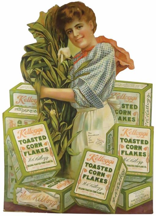 Kelloggs' Toasted Corn Flakes Die Cut, Cardboard, Window Display. Some repaired tears and restoration otherwise good condition. 25 X 34 1/2 inches.
