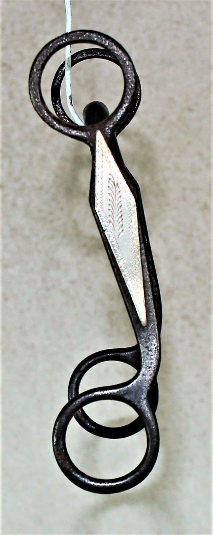 An uncommon iron grazing bit with elongated port, and nicely engraved long diamond silver shanks.