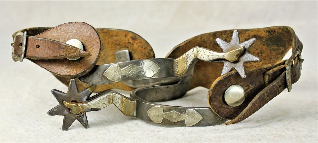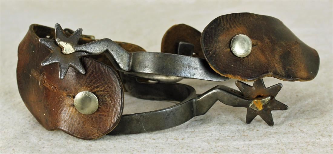 Desirable single mounted spurs with fine lady leg shanks, showing nice condition and original Heiser marked straps.