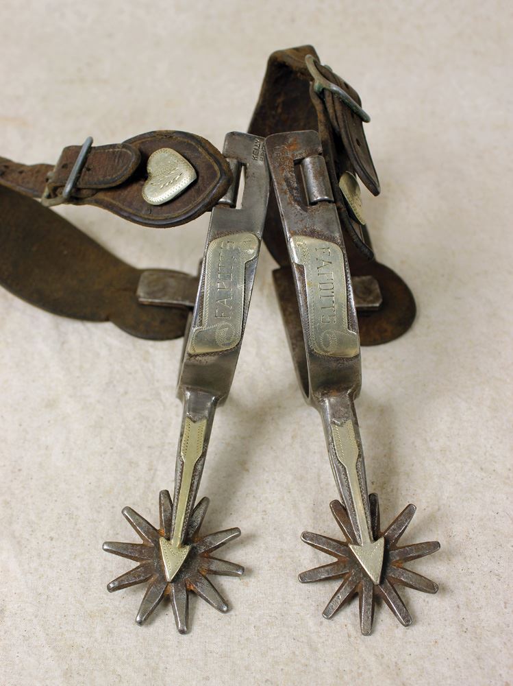 Appealing straight arrow shank single mounted Kelly Bro's with scrolls on heelband, swinging heart buttons and nice original straps.