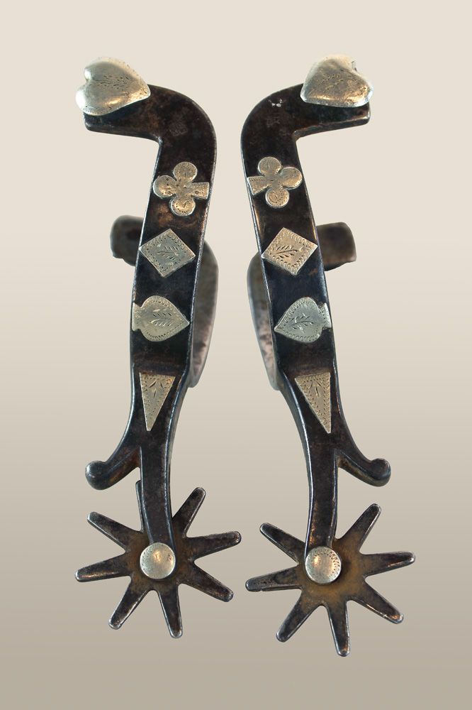Stylish pair of singlemounted spurs with detailed card suit silver mountings, with heart buttons, chap guards and 6-point rowels. In terrific condition.