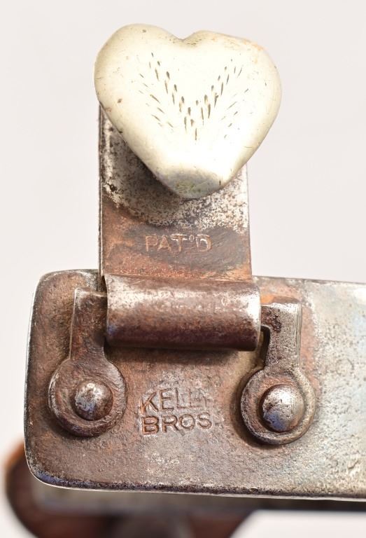 2.5" diamater rowels, silver sombrero overlay, silver heart strap buttons. Kelly Bros marked on heel-band. Period leather straps with floral pattern tooling.