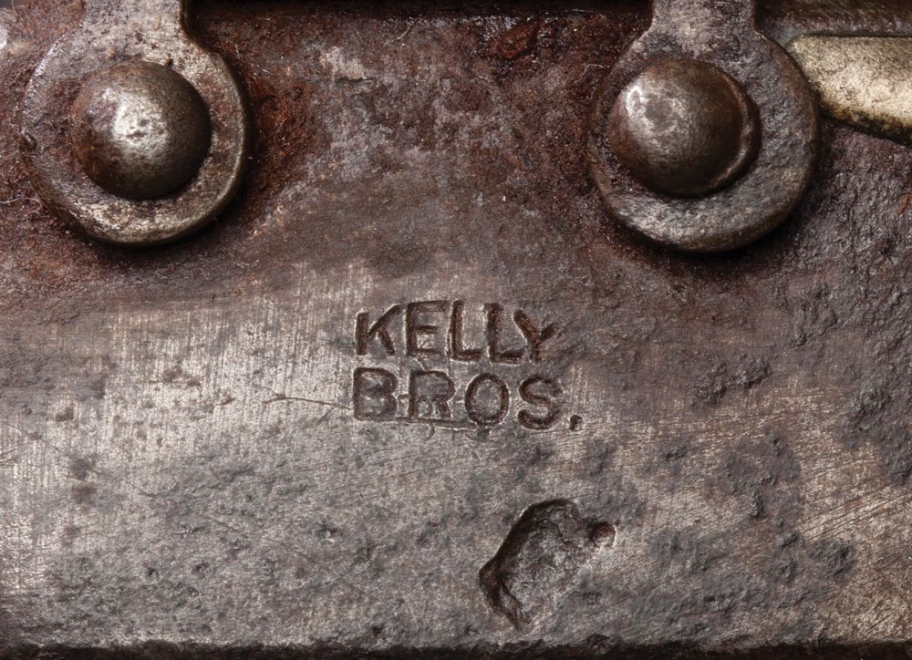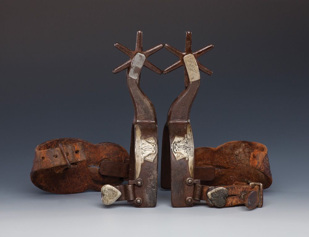 Kelly Bros. Steerhead Texas Spurs. Well maker-marked "Kelly Bros." just below the heart-shaped swinging button, El Paso, Texas steehead spurs with 6-point spoke rowels and original leathers. The spurs exhibit some rust, but minimal use overall. 100% original "as found" condition with a missing rowell pin cover on the right spur, and damaged leather straps.