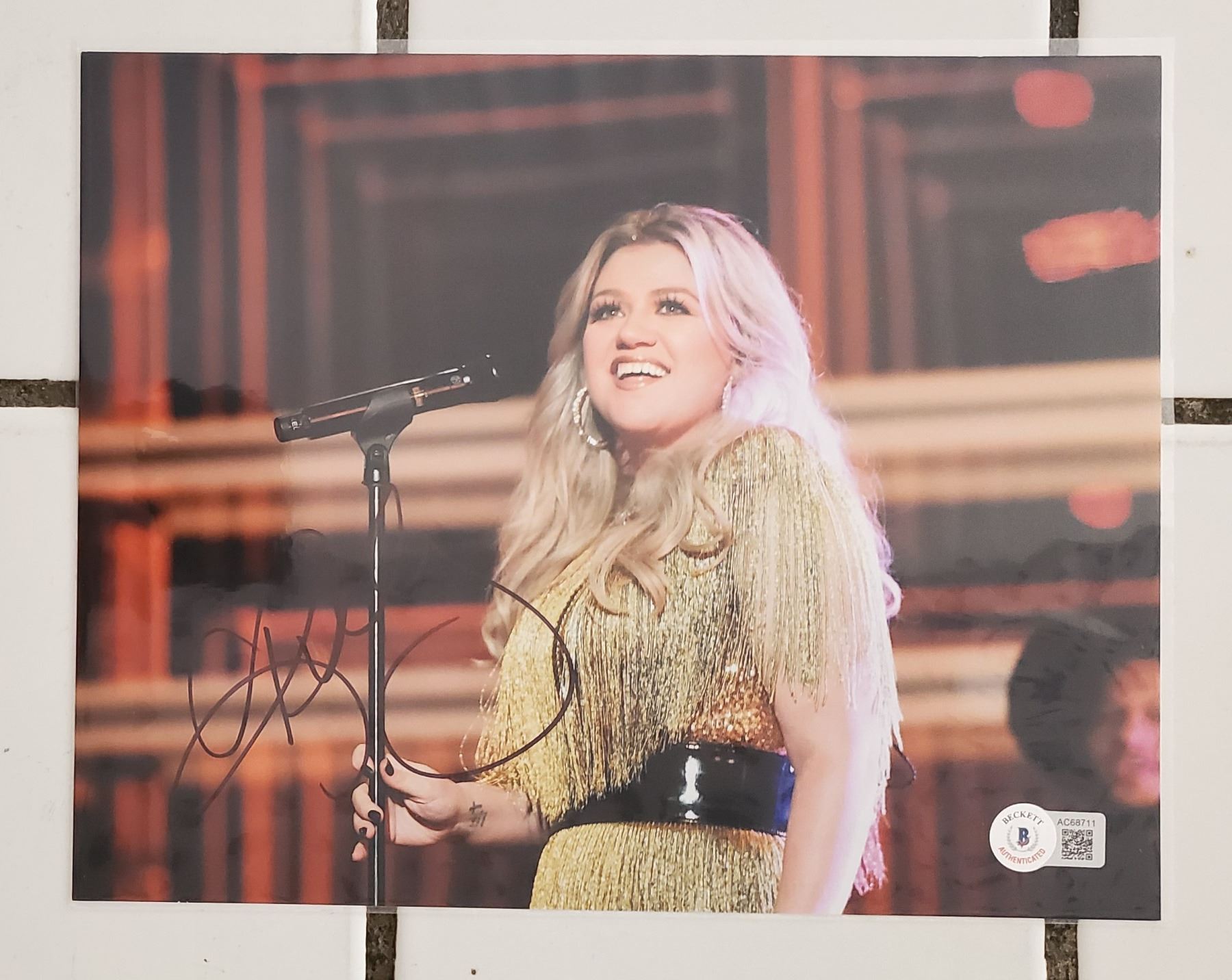 An 8” x 10” photograph signed by Kelly Clarkson. Beckett authenticated the autograph, providing a COA numbered AC68711 (sticker only).
