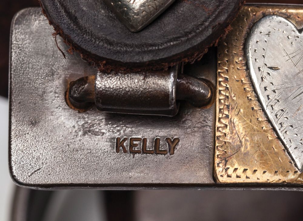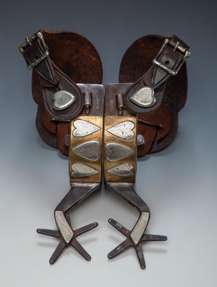 Kelly Four Heart Spurs. Large pair of crooked shank spurs with two-tone brass and silver mountings, 3 stretched hearts on the 1 1/4" bands, and one on the swinging button. The old style 5-point rowel is 2 1/4" across. These have a great old look with vintage straps and large nickel conchos.