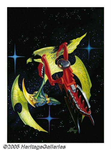 <B>Kelly Freas - Analog Cover Original Art (1991).</B></I> Acrylic on board with an 10" x 14" image area. In Excellent condition and signed and dated at the lower right. Two spacecraft, in insect-like forms, do terrible battle in outer space. Kelly has been described in the <B>Clute/Nicholls Encyclopedia of Science Fiction</B></I> as "the most popular science-fiction artist in the history of the field". His imagination is boundless, as this fantastic cover image aptly demonstrates.