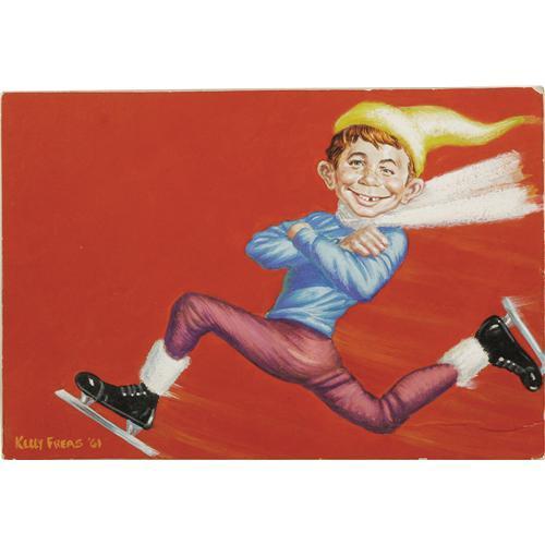 <B>Kelly Freas - Mad #70/Alfred E. Neuman Skating Cover Preliminary Painting Original Art (1961).</B></I> Kelly Freas may have had a spectacular career as a science fiction artist, but for many of his fans, his legendary "<B>Mad</B></I>-sterpieces" just can't be beat. This silly scene was painted as a preliminary study for the cover of <B>Mad</B></I> #70. Kelly Freas' vintage, hand-written note on the back of the piece reads, "Jim, This makes you the possessor of the only original Alfie ever to escape from the <B>Mad</B></I> offices. It's part of an unfinished painting eventually reversed left to right and used as a cover last winter. Best -- Kelly Freas." This painting, done on illustration board, has an overall size of 8.75" x 6", and the art is in Very Good condition.<BR><BR><b>Shipping:</b> Small Flat (<a target="_blank" href="http://www.heritageauctions.com/common/shipping.php">view shipping information</a>)